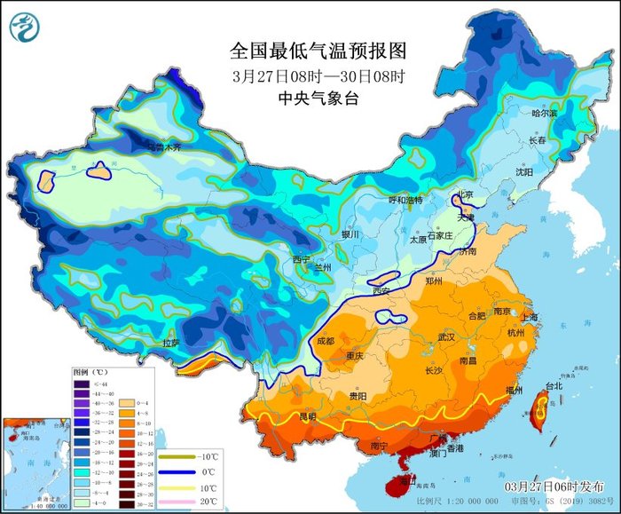 中央氣象臺(tái)3月27日06時(shí)繼續(xù)發(fā)布寒潮藍(lán)色預(yù)警: