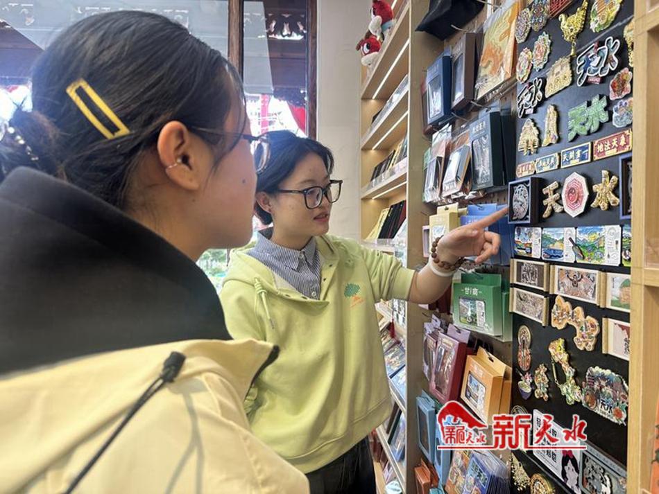 甘肅特產(chǎn)購(gòu)物中心店長(zhǎng)武燦介紹,清明假期客流量明顯增加,伏羲八卦、木質(zhì)團(tuán)龍團(tuán)鳳冰箱貼、甘肅地圖文創(chuàng)等富含天水文化特色的產(chǎn)品備受青睞。此外,店內(nèi)推出以甘肅特色食品為主的優(yōu)惠活動(dòng),希望讓游客品嘗地道風(fēng)味。