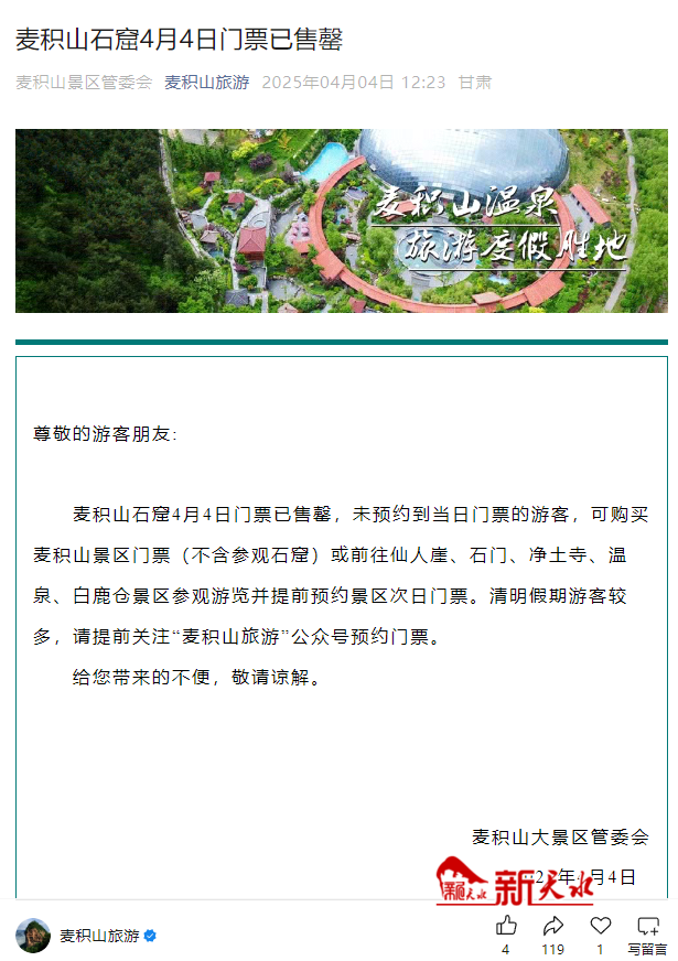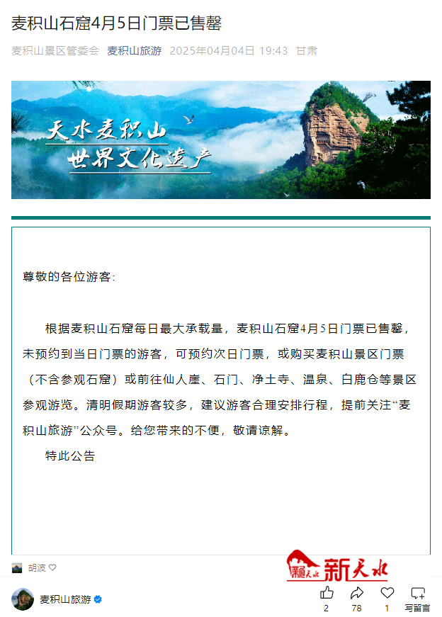 在做好保障游客良好出行體驗(yàn)措施的同時(shí),麥積山大景區(qū)著力營(yíng)造假期旅游氛圍,通過抖音、微信、小紅書等新媒體平臺(tái),多渠道開展文化自然遺產(chǎn)保護(hù)、景區(qū)風(fēng)光、票務(wù)信息等主題宣傳活動(dòng),加大景區(qū)宣傳營(yíng)銷深度和廣度。同時(shí),發(fā)布了清明小長(zhǎng)假旅游攻略、實(shí)時(shí)游客容量、票務(wù)預(yù)警信息等宣傳視頻,讓社會(huì)各界人士及時(shí)了解景區(qū)最新資訊。