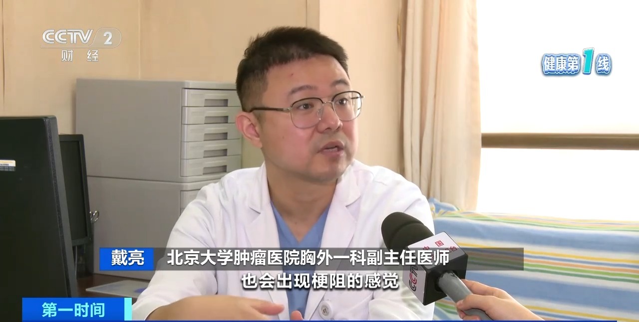 北京大學(xué)腫瘤醫(yī)院胸外一科副主任醫(yī)師 戴亮:患者牧先生是典型的食管癌癥狀——進(jìn)行性吞咽困難。隨著腫瘤增大,吃軟質(zhì)的半流食、流食的東西也會(huì)出現(xiàn)梗阻感覺,甚至到晚期,病人喝水都會(huì)覺得不好下(咽)。當(dāng)腫瘤特別大侵犯到周圍臟器,會(huì)出現(xiàn)比如胸背部疼痛、聲音嘶啞,甚至出現(xiàn)嗆咳、喘氣困難。