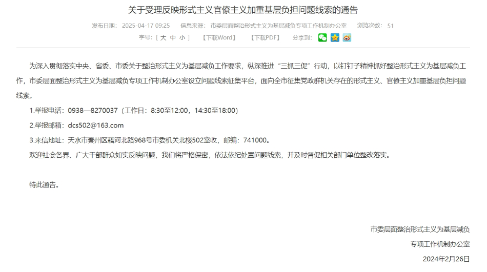 關(guān)于受理反映形式主義官僚主義加重基層負(fù)擔(dān)問(wèn)題線(xiàn)索的通告