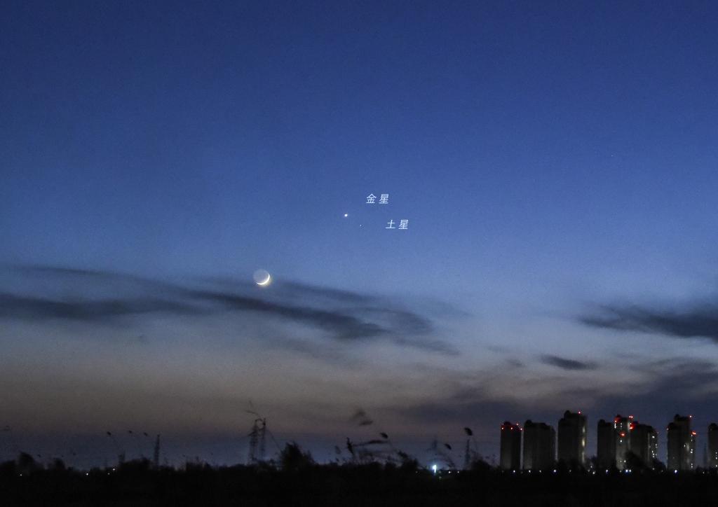 中國天文學會會員、天津市天文學會理事楊婧介紹,4月日出的東方天空里,金星和土星逐漸靠近,上演“星星相吸”。25日這天,農(nóng)歷三月二十八的細細殘月也來到這片天區(qū)稍作停留,三者剛好組成一個三角形,形成“雙星拱月”之勢。