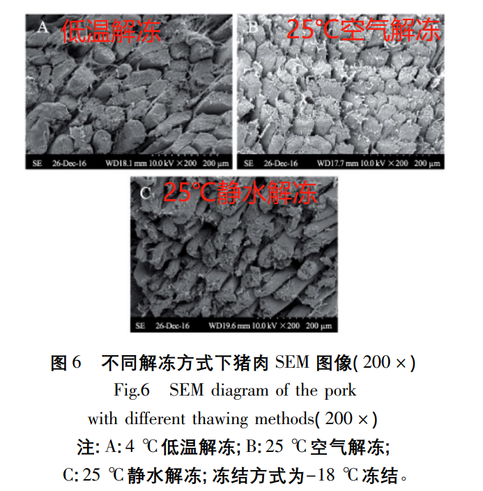 一篇發(fā)表在《食品工業(yè)科技》上的文獻(xiàn)顯示,研究人員用實驗對比了不同解凍方式對豬肉品質(zhì)的影響,包括 25℃ 室溫解凍、25℃ 靜水解凍、4℃ 低溫解凍。結(jié)果表明 4℃ 低溫解凍雖然比較慢,但不僅能降低細(xì)菌的繁殖,還能抑制脂肪的氧化。較慢的解凍還可讓肉類中的水分有充分的時間滲透遷移到組織之中,盡量維持飽滿的狀態(tài),能夠較好的保持肉類品質(zhì)。