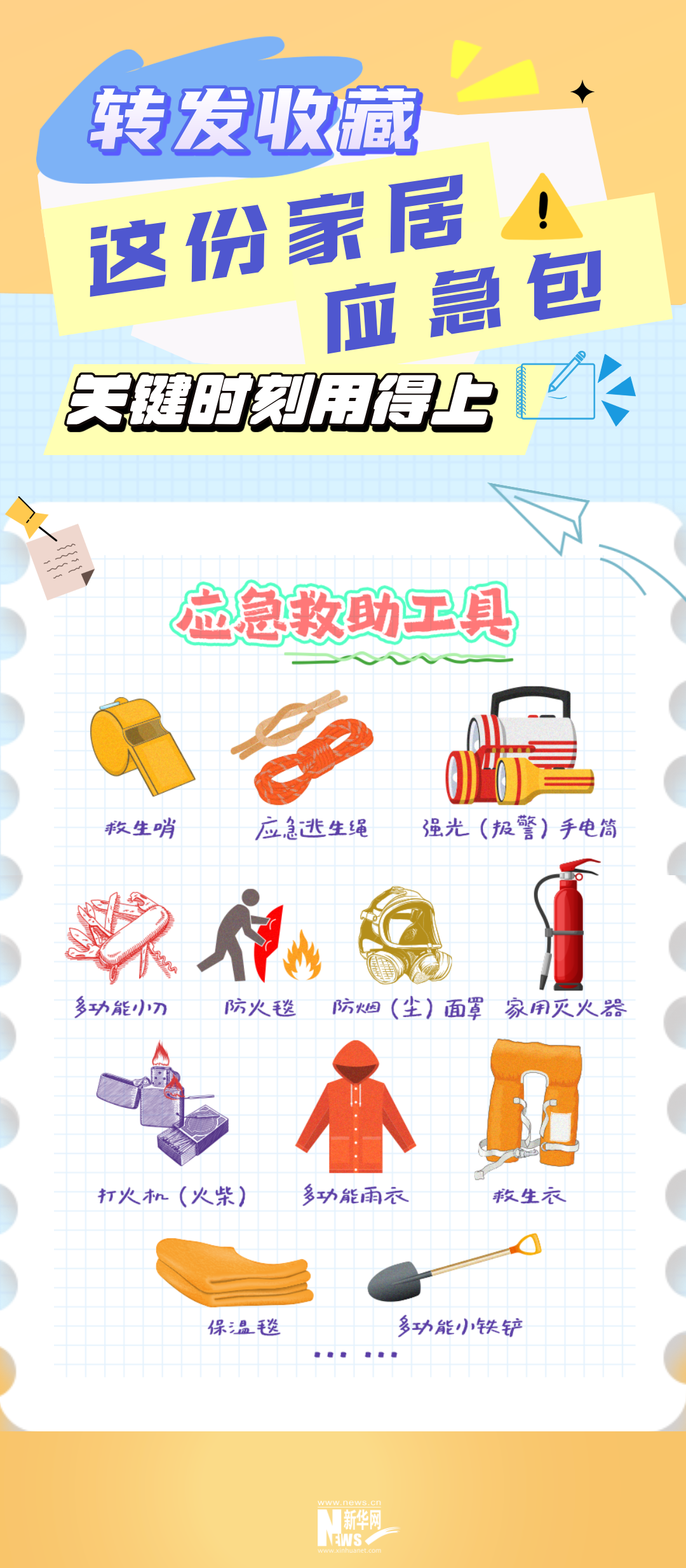 手電筒、救生哨、應(yīng)急逃生繩、瓶裝水、餅干、罐頭、創(chuàng)可貼、碘伏棉棒……發(fā)生災(zāi)情時,自救是最迅速有效的。日常居家,應(yīng)準(zhǔn)備哪些應(yīng)急物品?2025年5月12日是第17個全國防災(zāi)減災(zāi)日,轉(zhuǎn)發(fā)收藏這份“應(yīng)急包”,關(guān)鍵時刻用得上!