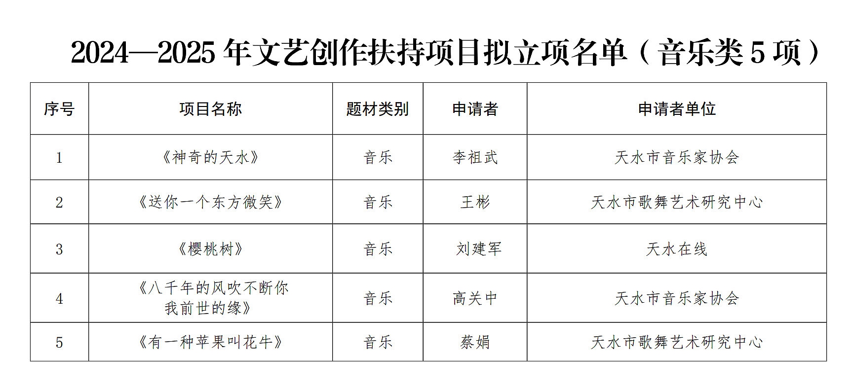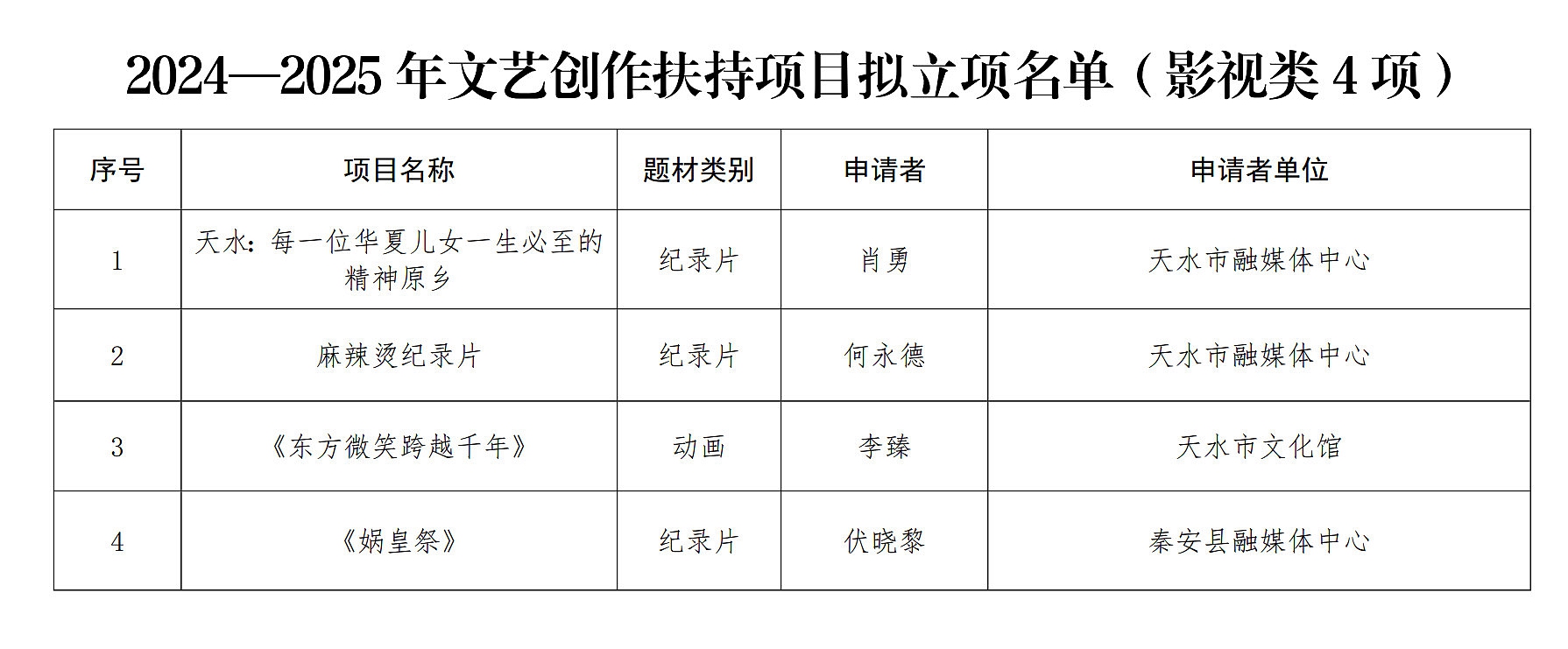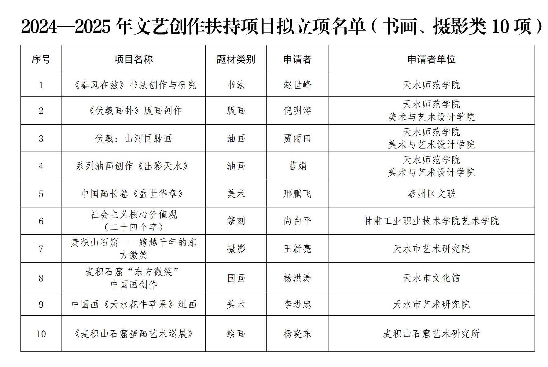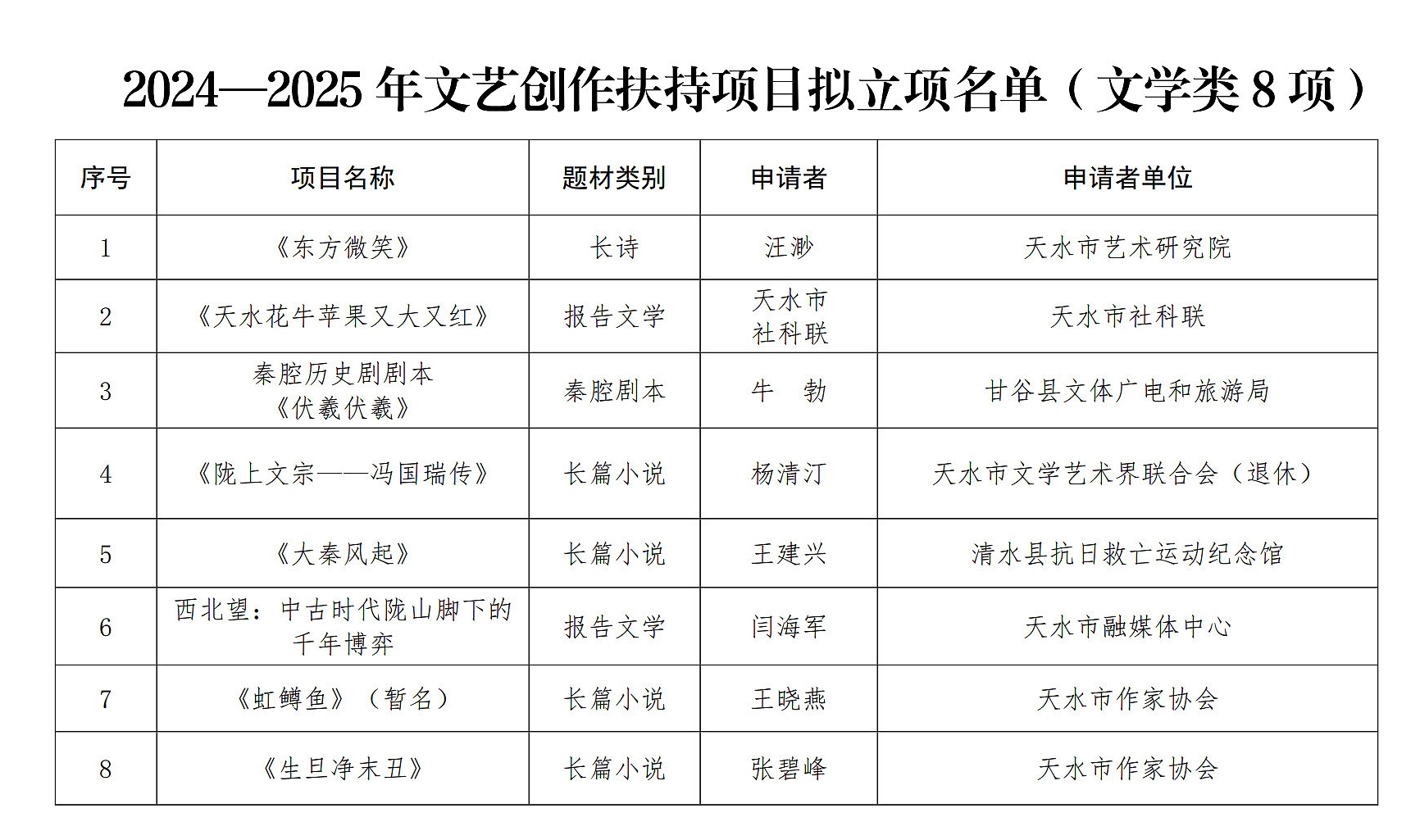 經(jīng)專家評(píng)審、會(huì)議研究,決定對(duì)《東方微笑》等36個(gè)文藝創(chuàng)作項(xiàng)目予以立項(xiàng),現(xiàn)將2024—2025年度文藝創(chuàng)作扶持項(xiàng)目擬立項(xiàng)扶持名單予以公示,公示期為5個(gè)工作日(2025年6月9日至6月13日)。公示期間,如有異議,請(qǐng)以個(gè)人真實(shí)署名的形式向中共天水市委宣傳部提出書面意見。