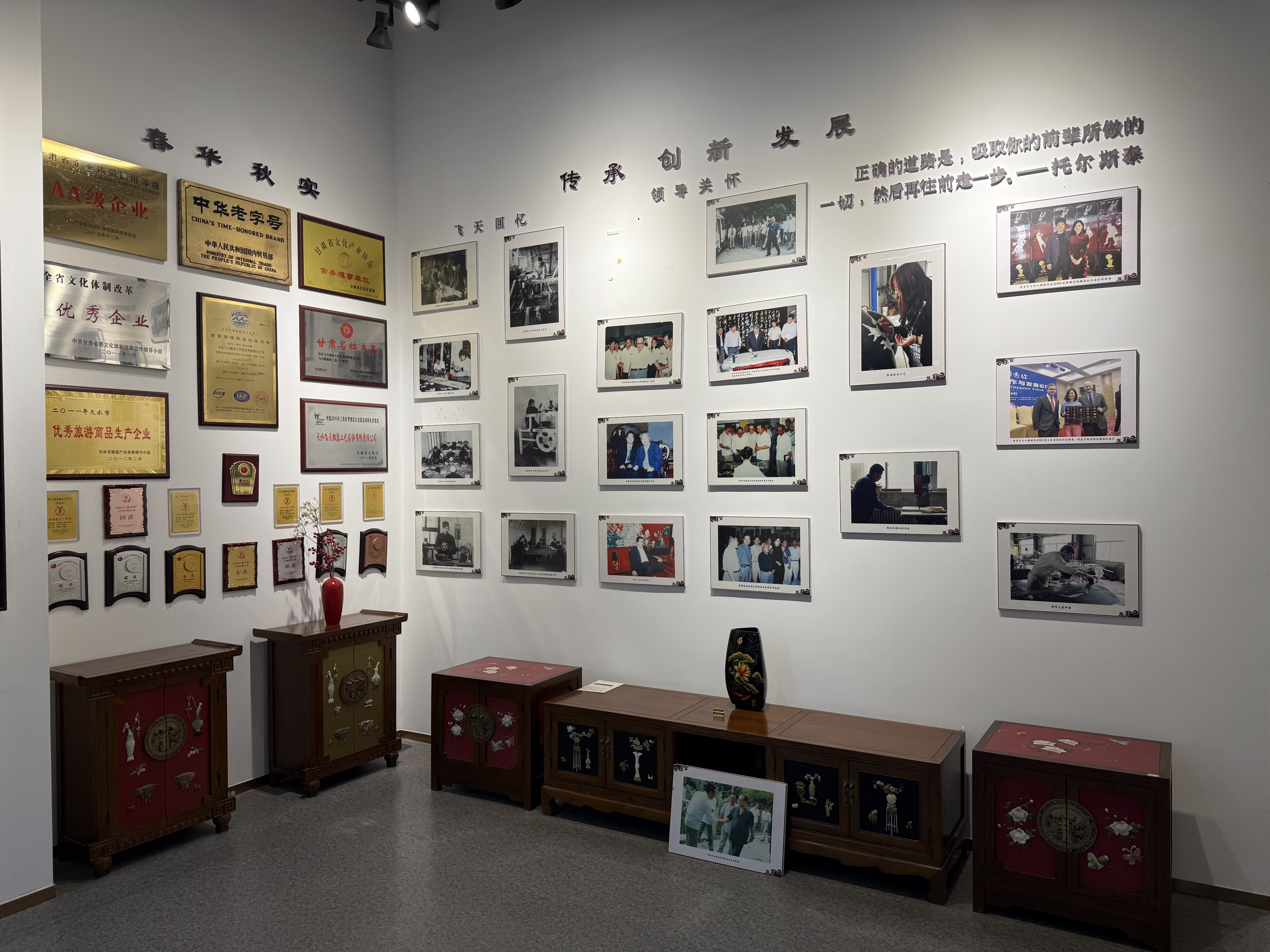 天水飛天雕漆擁有深厚的百年根基,其歷史可追溯至1916年成立的手工藝聯(lián)社,歷經(jīng)發(fā)展,于1957、1958年成為地方國(guó)營(yíng)工藝廠。2000年前后順應(yīng)時(shí)代變革,成功改制。在這一百多年間,該工藝歷經(jīng)不斷代傳承,在制作工藝方面,通過吸收、學(xué)習(xí)、自我發(fā)揮和創(chuàng)造形成了一系列不同的裝飾手法。現(xiàn)裝飾手法常用的有八大類工藝,立足于傳統(tǒng)文化和地域文化,開發(fā)出適應(yīng)不同場(chǎng)所、不同審美需求的漆器產(chǎn)品,做出了很多深受消費(fèi)者歡迎的漆器產(chǎn)品,形成了良好的市場(chǎng)口碑和反響。
