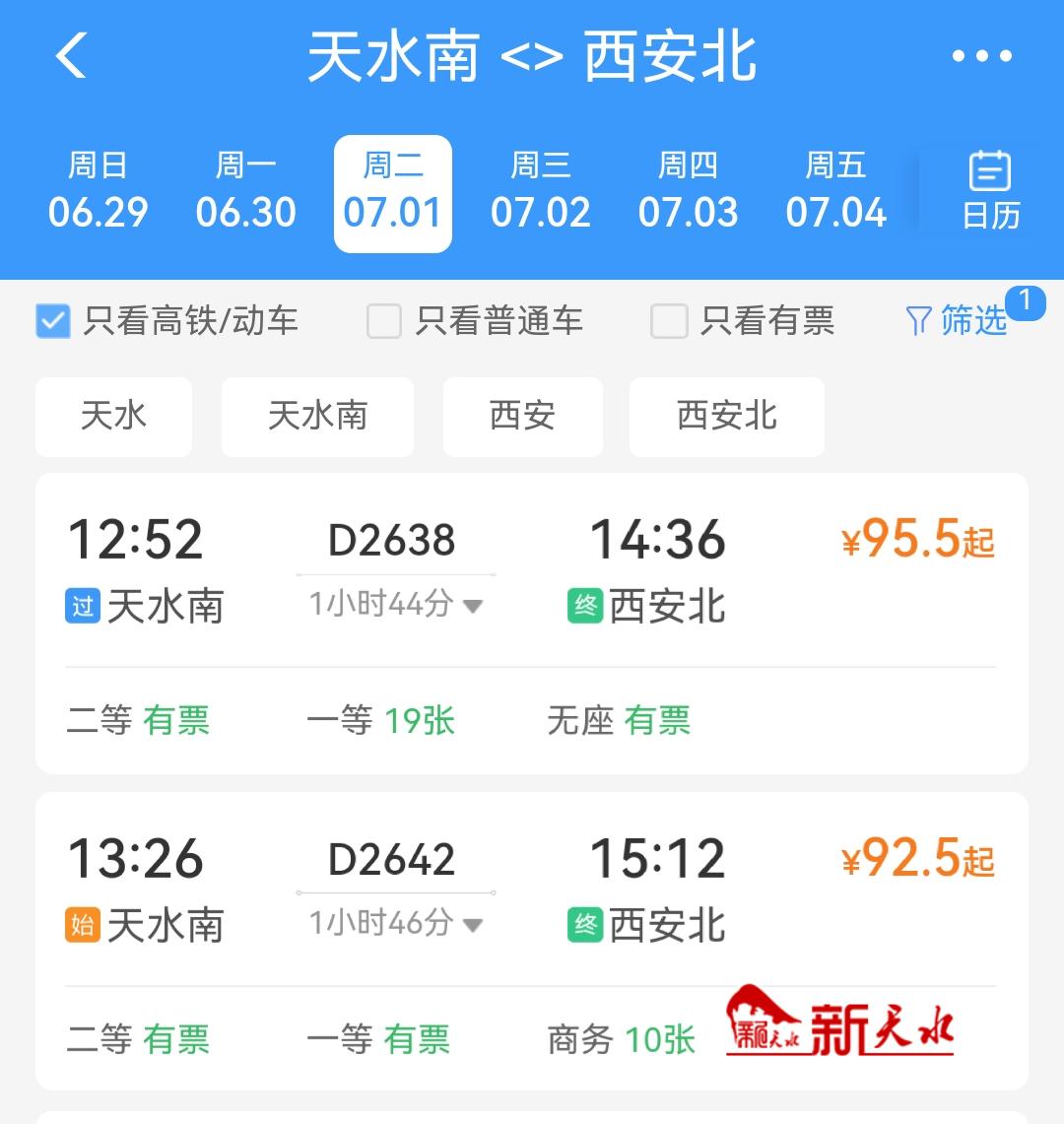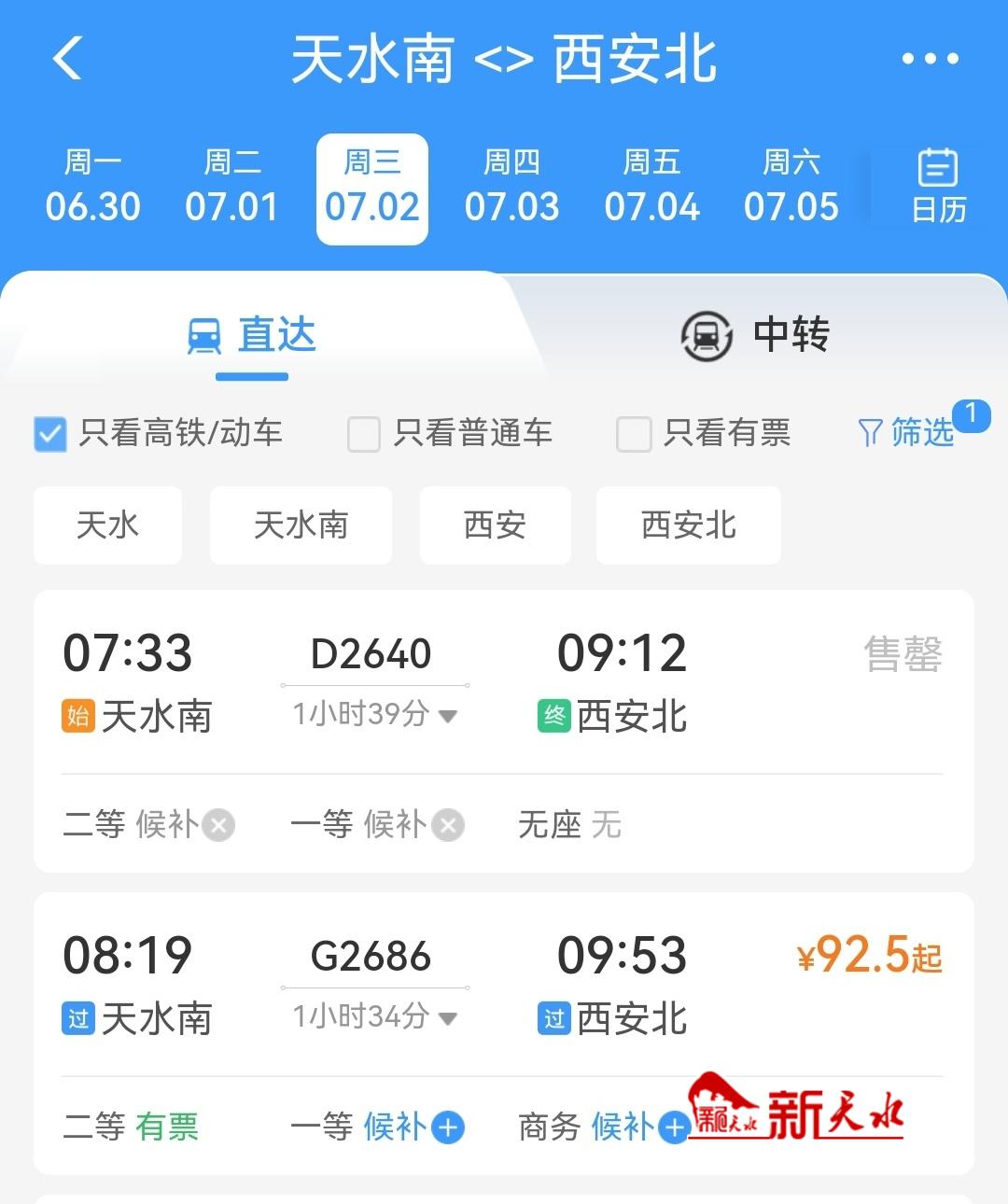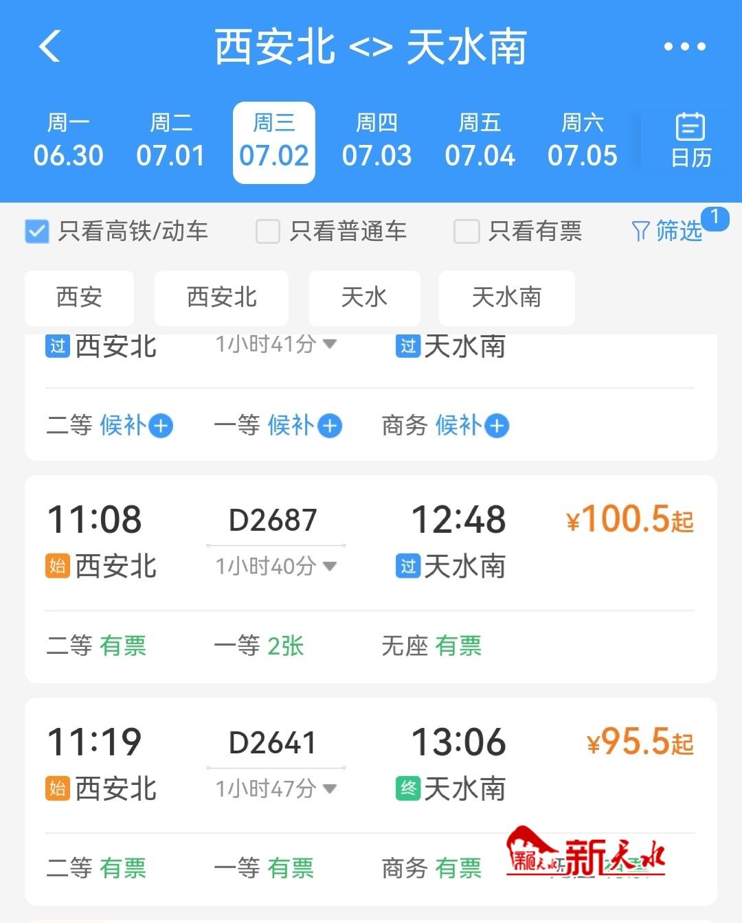 記者通過查詢了解到,第一趟天水南至西安北的列車為D2640次列車,天水始發(fā)時間為7:33,終到時間為9:12;第二趟為天水南至西安北的D2642次列車,始發(fā)時間為13:26,終到15:12。西安北至天水南的第一趟D2641次列車,11:19始發(fā),13:06終到天水;第二趟西安北至天水南的D2639次列車,20:38始發(fā),22:30終到天水。7月2日,天水南至西安北的D2640次列車車票已經(jīng)售罄。