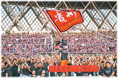 9月19日,2025城市足球邀請(qǐng)賽在貴州省貴陽(yáng)市奧體中心體育館開(kāi)賽。圖為觀(guān)眾在現(xiàn)場(chǎng)加油。新華社記者 楊文斌攝