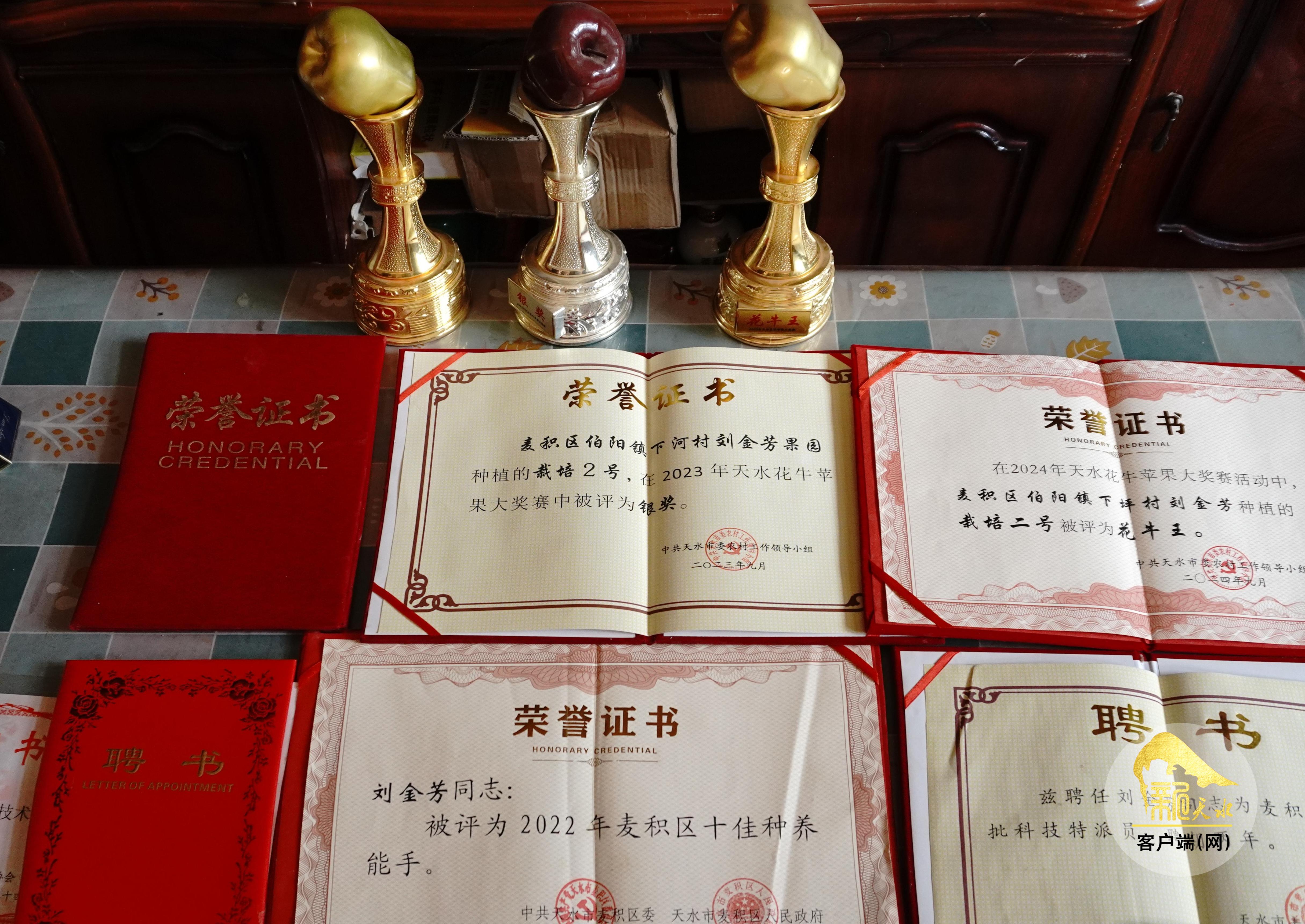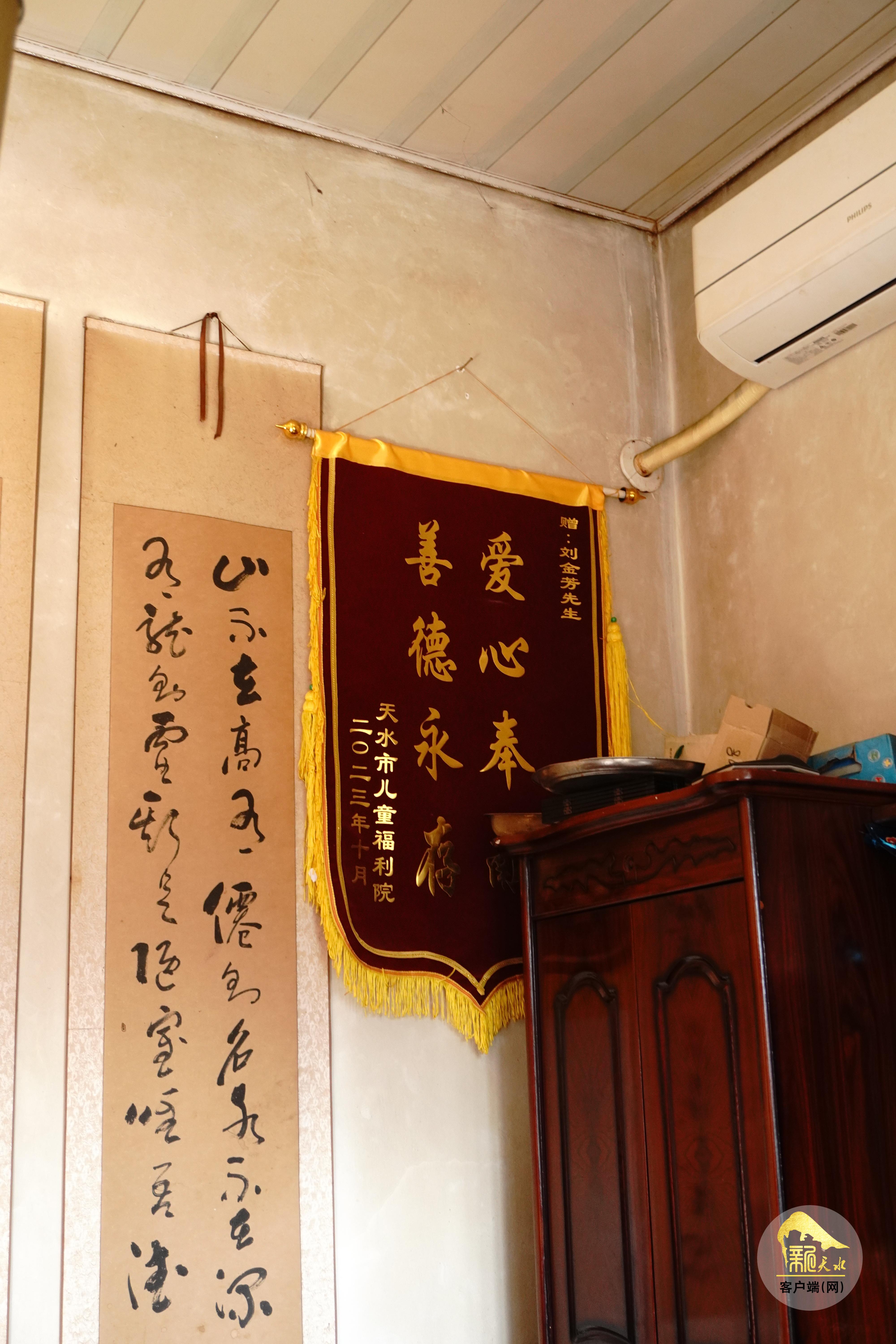 第一次參加評獎就獲得了好名次,劉金芳對管理果樹更加盡心了。在接下來的2023年和2024年,他又連續(xù)兩次參加評比,而且都獲得了金獎。這兩屆評選出的“花牛王”舉行了有多家企業(yè)參加的拍賣活動,2023年的“花牛王”拍出28888元,2024年的拍出29999元。兩次拍賣所得,他全部捐獻(xiàn)給了公益組織,天水市兒童福利院也因此受益,于是有了這面錦旗。