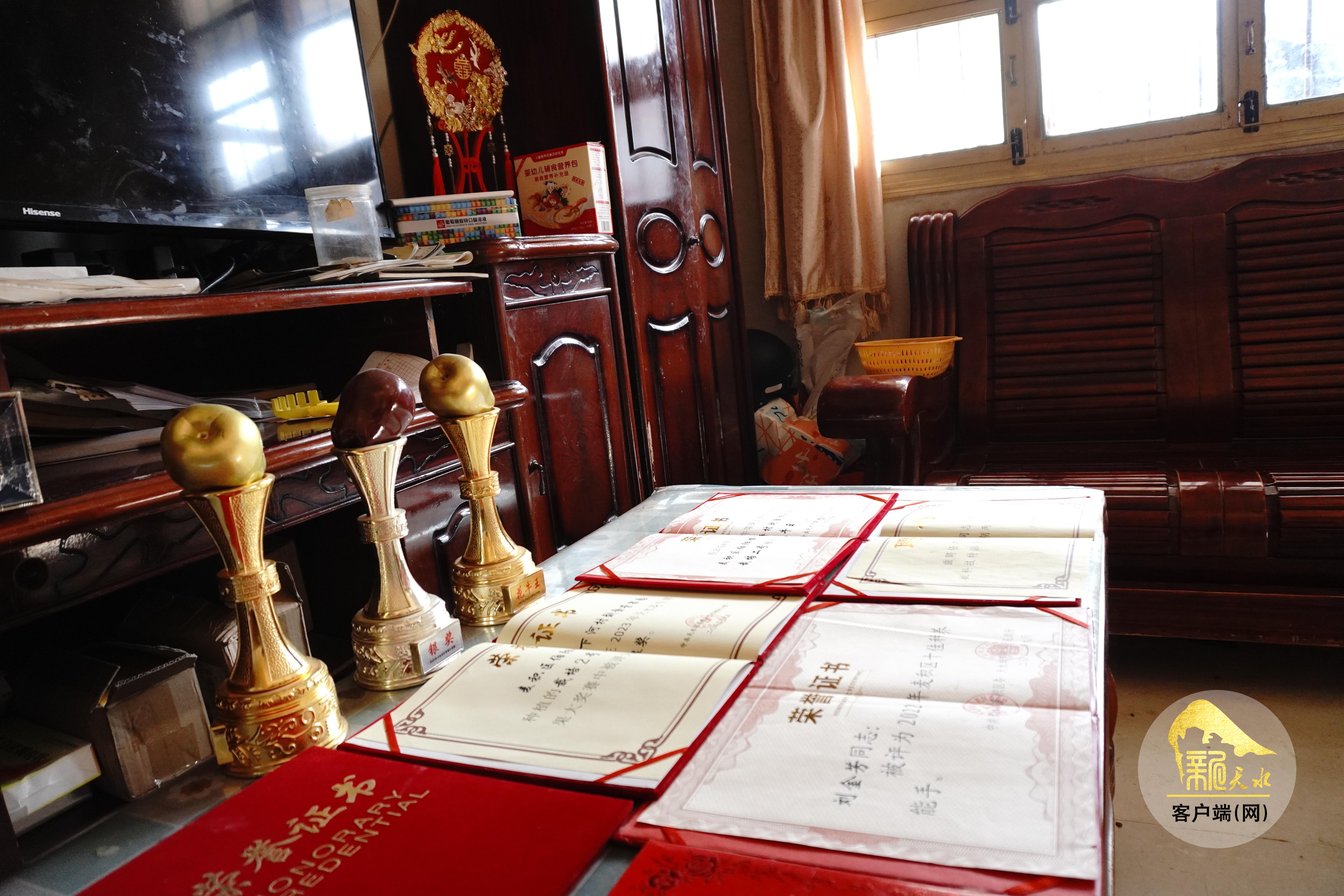 劉金芳家里的墻上有一面天水市兒童福利院贈送的錦旗,上面寫著“愛心奉獻(xiàn) 善德永存”八個(gè)大字。說起這面錦旗,劉金芳講述了它的來歷。2022年村干部通知他參加天水市農(nóng)業(yè)農(nóng)村局組織的“花牛王”評選活動,當(dāng)時(shí)他心里有些忐忑,村上有些種植戶比他經(jīng)營果樹更早,有些年輕人比他更有知識和技術(shù),自己的果子有那么好嗎?不過村干部的勸說打消了他的疑慮。那一年的“花牛王”評選,果樹專家們通過單果重量、著色度、果型指數(shù)、可溶性固形物等指標(biāo)檢測,他選送的“栽培二號”獲得了銀獎。