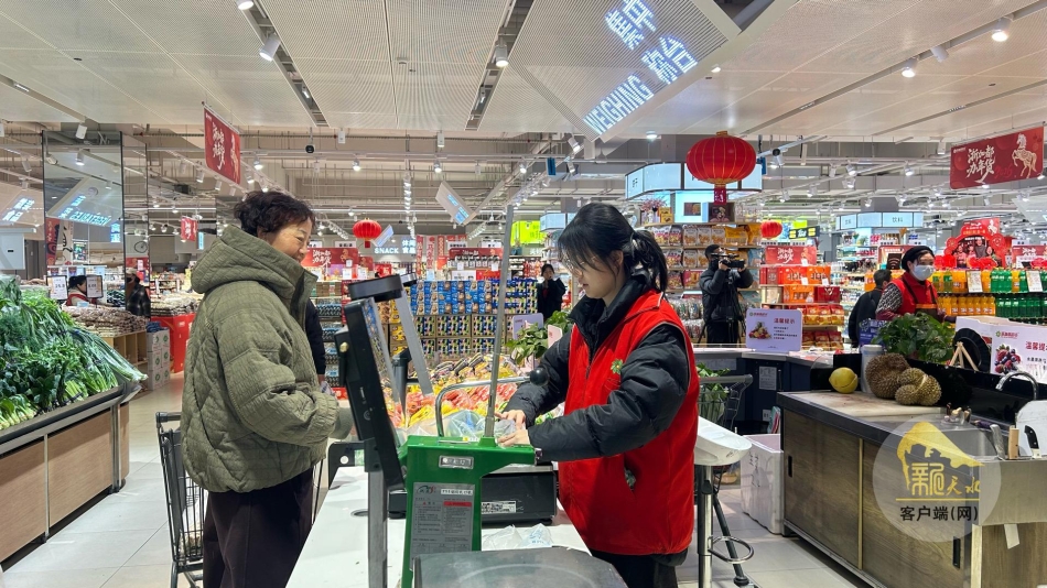 在秦州區(qū)合作南路一家大型超市內(nèi),新春福字、掛飾等裝飾品及各式年貨禮盒擺放在超市顯眼位置,新鮮上架的蔬菜、水果、肉類等生鮮食材滿滿當(dāng)當(dāng)排滿貨架。不少市民推著購(gòu)物車穿梭在貨架間仔細(xì)挑選,收銀臺(tái)前不時(shí)排起長(zhǎng)隊(duì),處處都是忙碌又熱鬧的采購(gòu)景象。