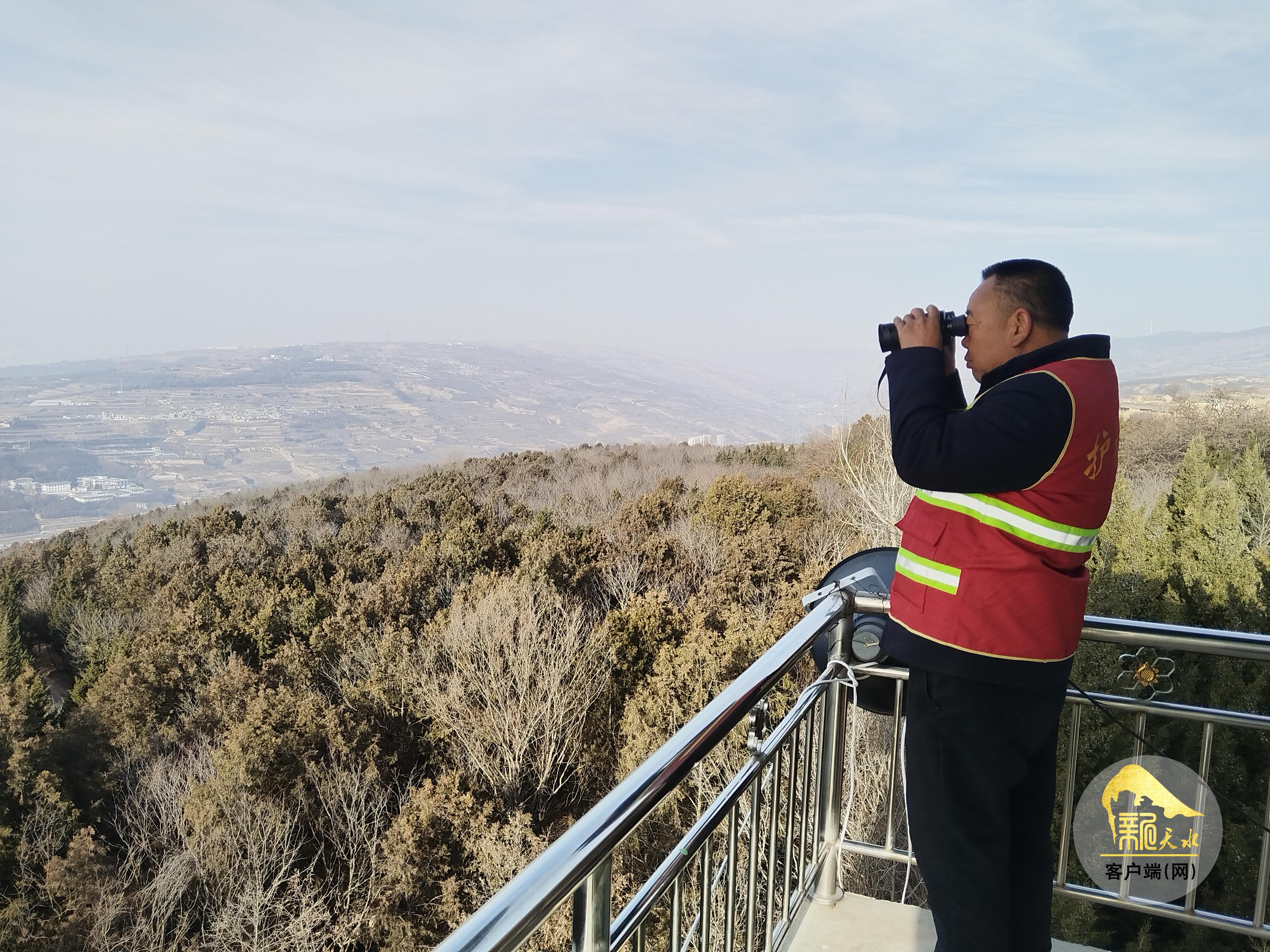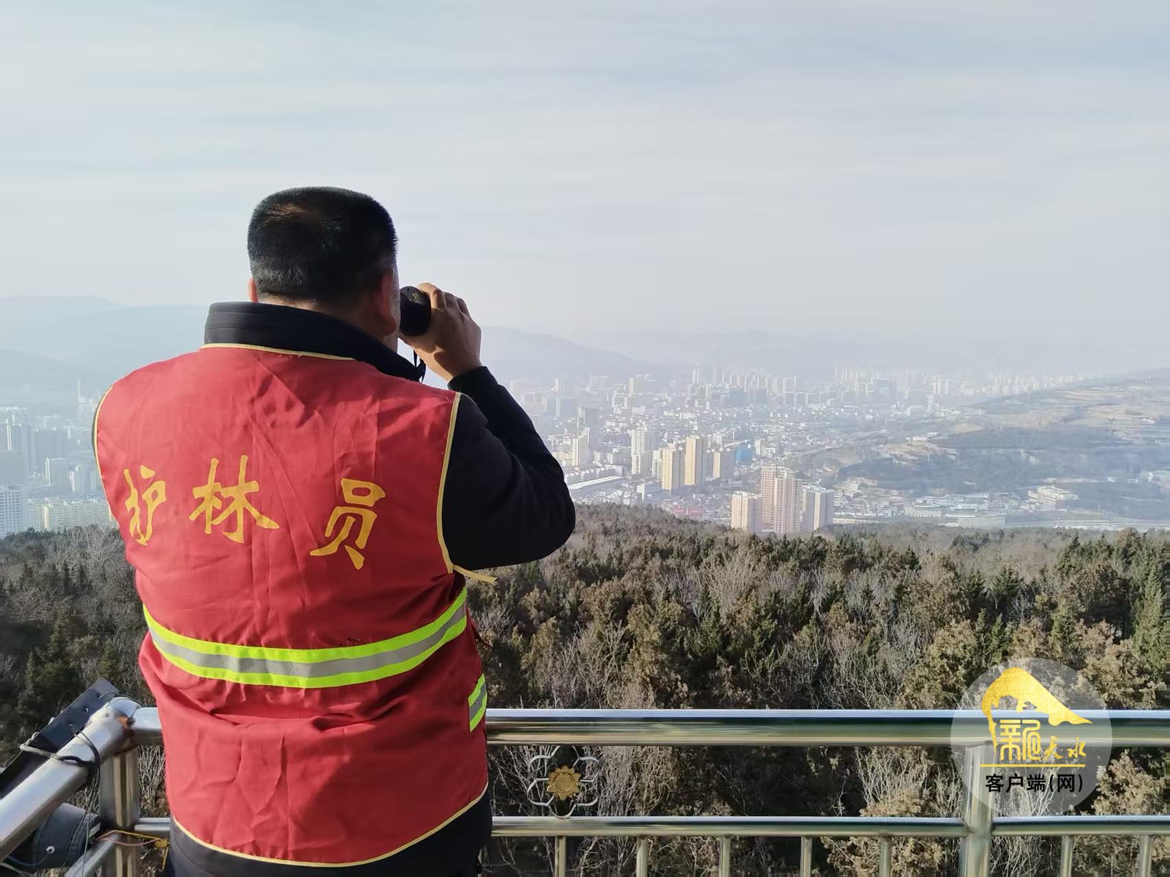 “進入林區(qū),防火第一,共享森林美景,嚴防森林火災……”2月13日,在秦州區(qū)北山林區(qū)重要路口,智能語音播報器循環(huán)播放著防火宣傳語。不遠處,皇城堡北山防火瞭望塔上,安裝在塔頂的大喇叭也循環(huán)播放著防火宣傳內容。護林員孟世存手持望遠鏡,對周圍林區(qū)安全進行觀測,護林員24小時輪流值守在瞭望塔上,確保林區(qū)防火安全。