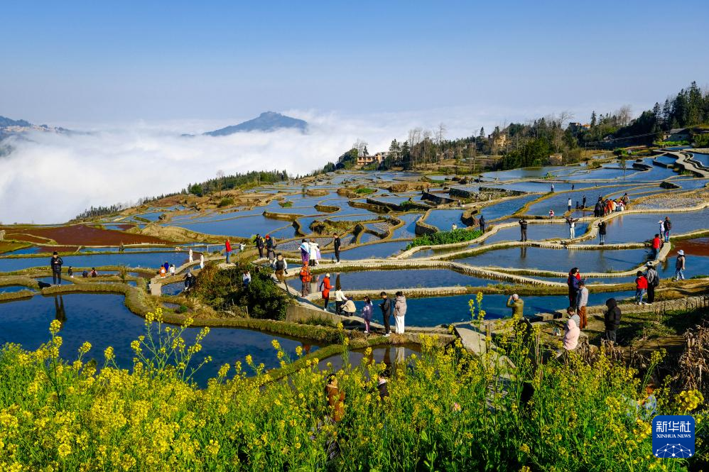 2月12日,游客在云南省元陽縣新街鎮(zhèn)愛春梯田景區(qū)游覽。新華社發(fā)(張洪科 攝)