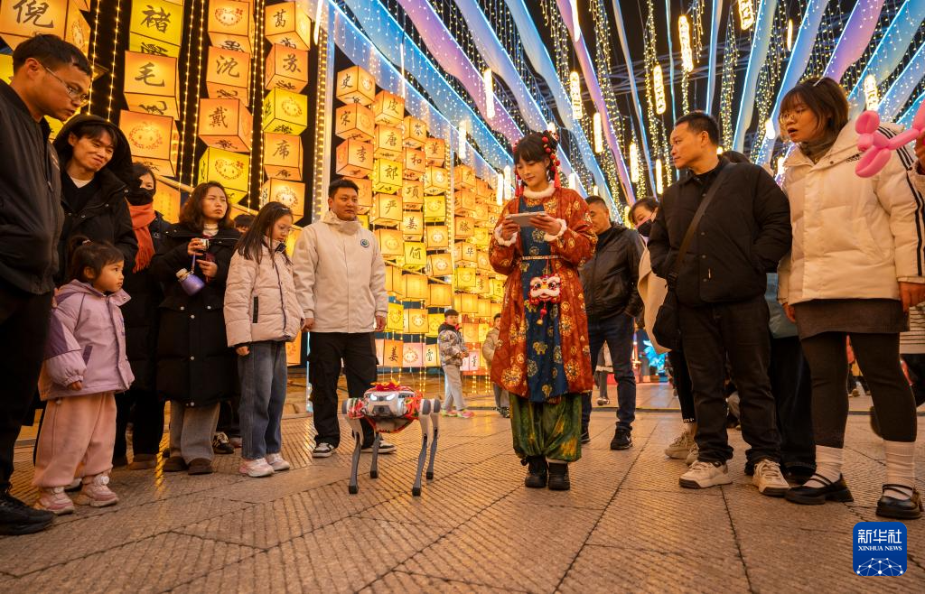 2月11日,在江西省新余市仙女湖新春燈會上,機器狗吸引了游人的目光。新華社發(fā)(趙春亮 攝)