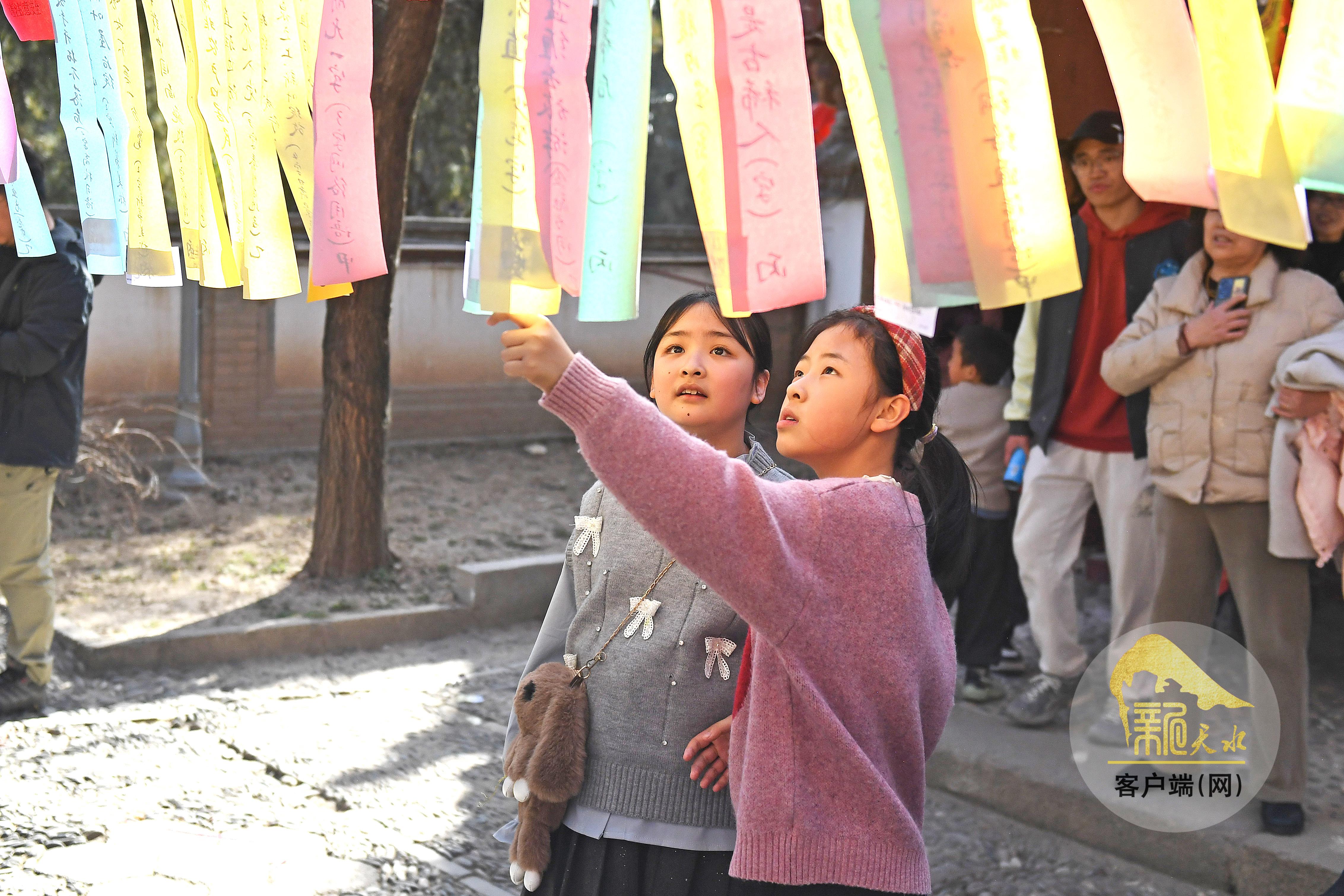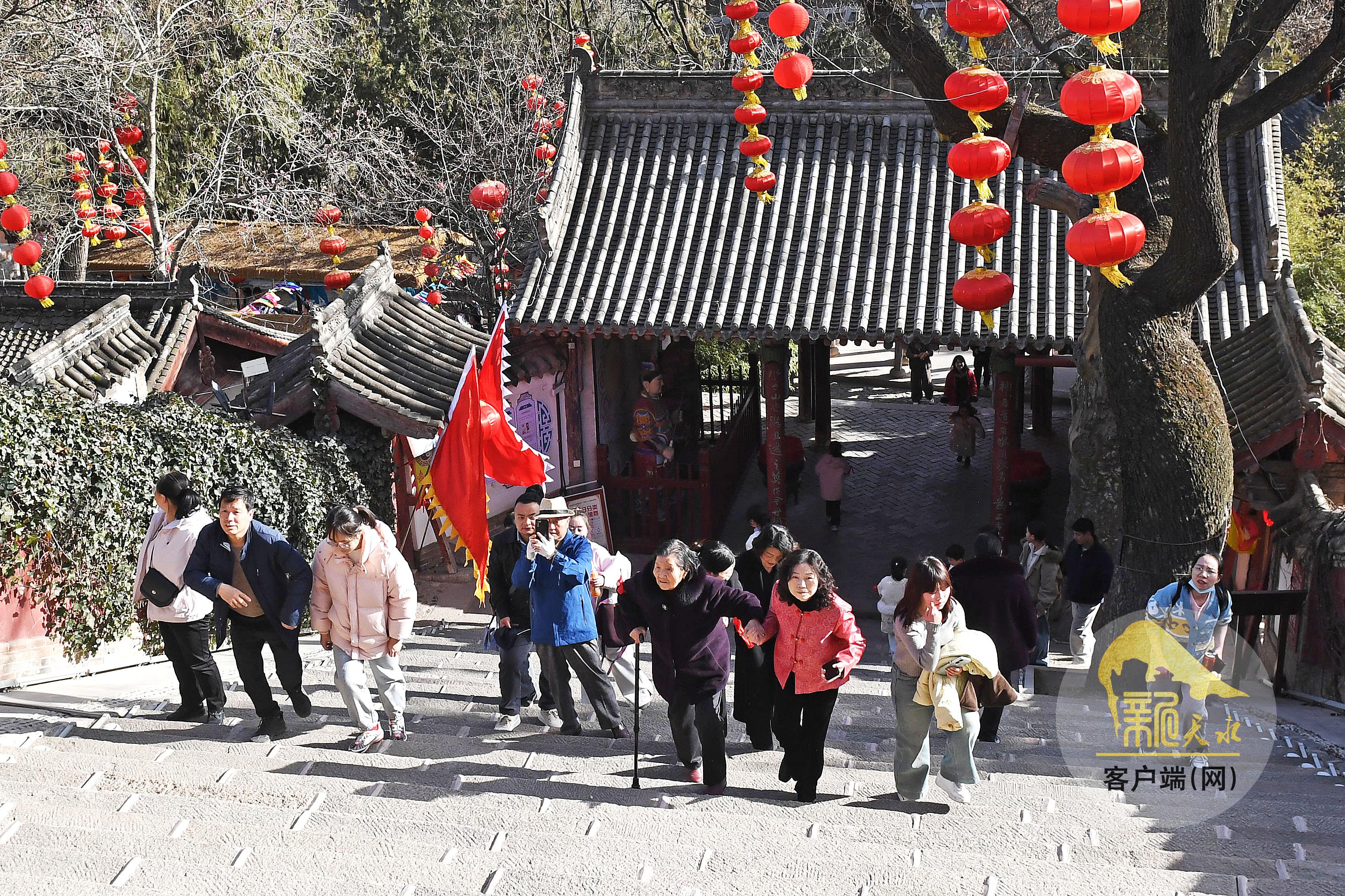 春節(jié)期間的玉泉景區(qū)燈籠高掛、彩旗招展。市民和游客紛紛參與民俗活動,沿著臺階游覽玉泉觀,系紅綢、摸香爐、猜燈謎,祈求福運吉祥。