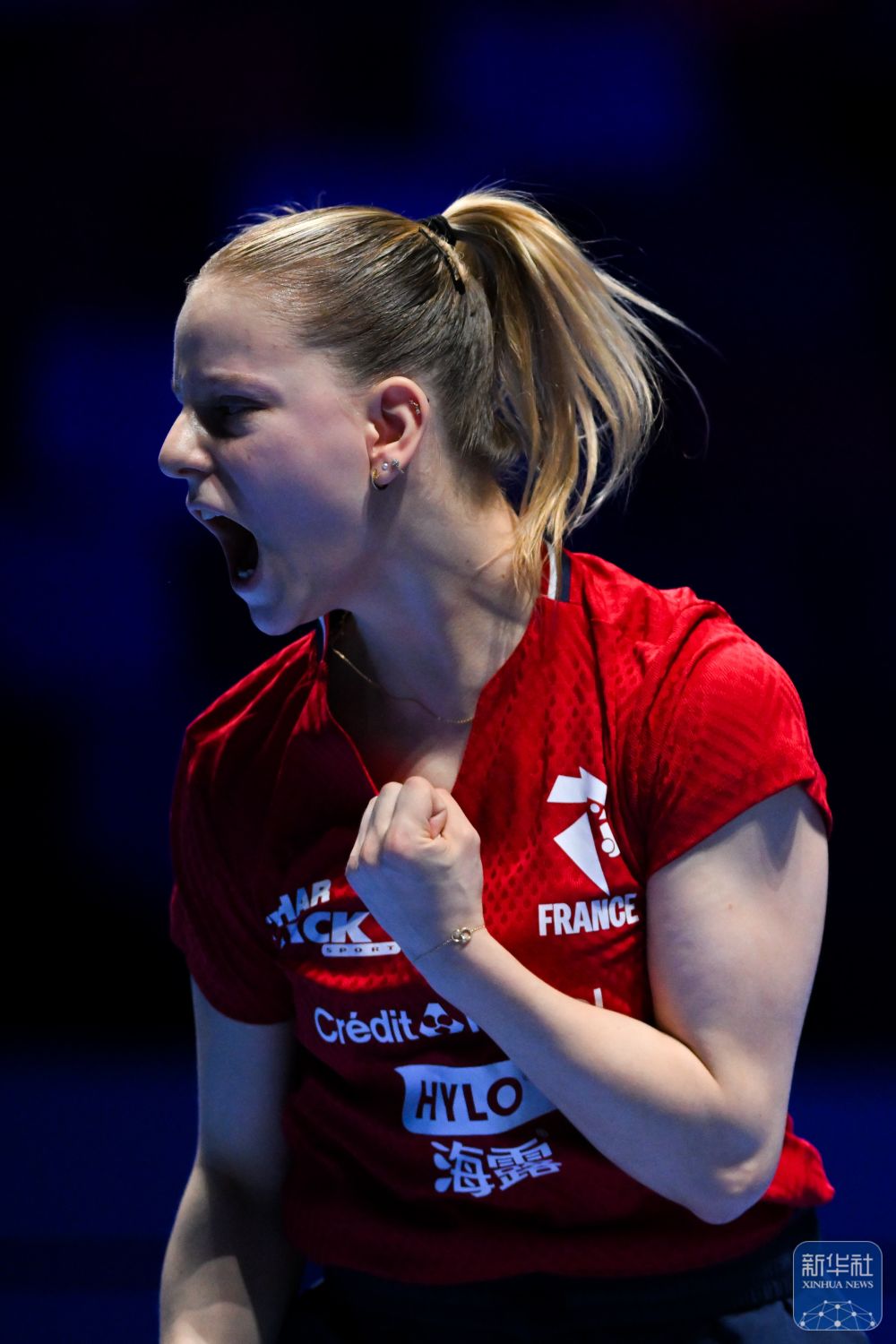 ↑法國選手夏洛特·盧茨在女子單打小組賽中慶祝得分。最終,她2比3不敵中國選手蒯曼。
