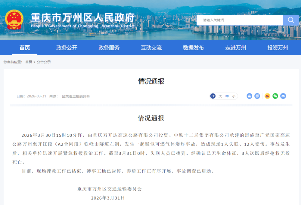 2026年3月30日15時10分許,由重慶萬開達(dá)高速公路有限公司投資、中鐵十二局集團(tuán)有限公司承建的恩施至廣元國家高速公路萬州至開江段(A2合同段)鐵峰山隧道左洞,發(fā)生一起疑似可燃?xì)怏w爆炸事故,造成現(xiàn)場1人失聯(lián)、12人受傷。事故發(fā)生后,相關(guān)單位迅速開展緊急救援救治工作。截至3月31日0時,失聯(lián)人員已找到、經(jīng)確認(rèn)已無生命體征,3人送醫(yī)后經(jīng)搶救無效死亡。