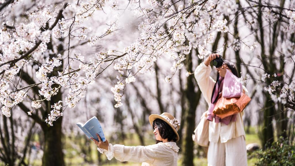 游客在貴州省貴安新區(qū)櫻花園內(nèi)拍照留念。新華社記者 陶亮 攝