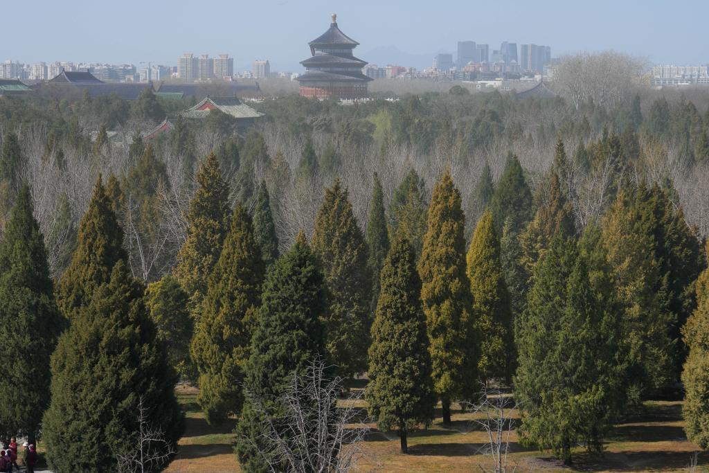 大風(fēng)吹拂下,北京天壇公園上空彌漫著花粉霧,公園開啟草地噴灌設(shè)施應(yīng)對。新華社記者 鞠煥宗 攝