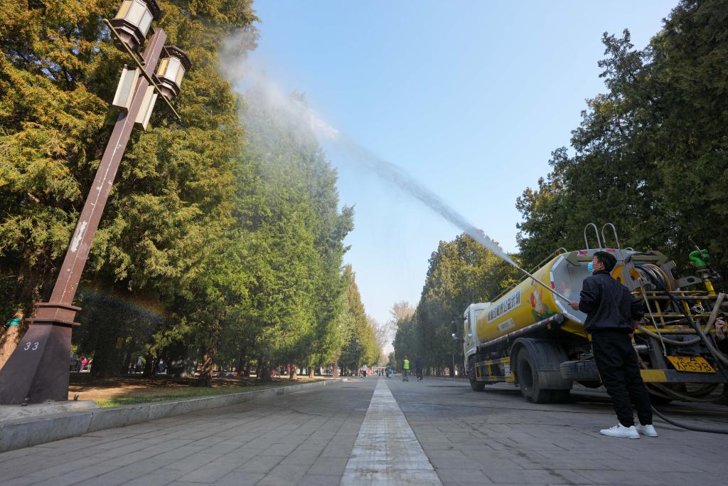 在北京地壇公園,工作人員使用添加了花粉固定劑的水對柏樹進行噴淋。新華社記者 鞠煥宗 攝