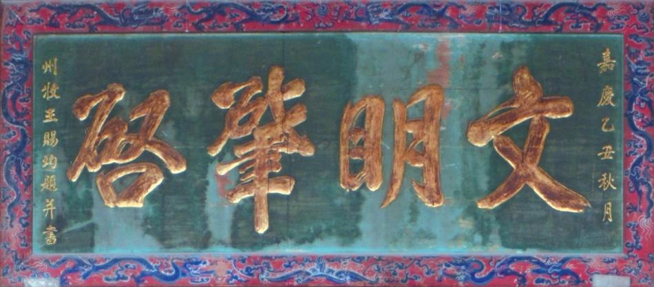 天水伏羲廟先天殿內(nèi)正中神龕上方懸掛“文明肇啟”匾額,為清嘉慶十年(1805年)九月,秦州知州王賜均所題。充分肯定了伏羲的功績(jī),贊頌伏羲爺開創(chuàng)了人類進(jìn)入文明的新時(shí)代。