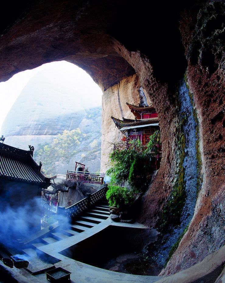 水簾洞高約50米、深20多米,為一巨大的天然巖洞,洞前綠樹成蔭,洞頂、洞壁皆有泉水從石縫淌下,形成了一道巨大的水簾,摸子泉即在洞內(nèi)。正殿菩薩樓內(nèi)塑有大勢(shì)至菩薩,清相豐潤(rùn),氣度嫻雅,相傳為麻線娘娘的真身塑像。相傳很早以前,榆盤鎮(zhèn)李家溝村有一女孩沒事總到廟里去玩,15歲的時(shí)候,家里給她許配了人家,可自此后她便總是坐在窗口打麻繩,一直打了幾年,直到出嫁時(shí)還在不停打麻繩。出嫁這天,她打扮了一個(gè)早晨后,便把麻繩的一頭系在窗子上,一頭系在自己的腰里跑了起來(lái)。全家人急了,媽媽拿著火棍子,哥哥拿著鞭子,嫂嫂拿著笤刷子追來(lái),她便一直往水簾洞跑去。當(dāng)跑到一個(gè)山溝里時(shí),繩子用完了,她就抽出腸子續(xù)上繼續(xù)跑,從此這個(gè)地方就叫徐家來(lái)(“徐、續(xù)”音相近)。一直跑到水簾洞后,她身子一縱跳入洞中,但沒有坐穩(wěn),一條腿還沒來(lái)得及收上去,家人便已趕到。家人問(wèn)她:“你如果是神,就讓火棍和笤刷子長(zhǎng)出葉子來(lái)?!惫唬捯魟偮?,那火棍兒、笤刷子便都長(zhǎng)出了葉子,長(zhǎng)成了樹,麻線女也成了麻線娘娘。