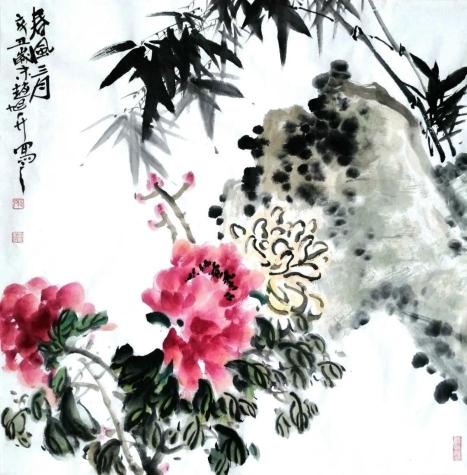 細(xì)觀他創(chuàng)作的花鳥畫《陽春三月》《嫣然墻角一枝梅》《桃花八哥圖》《東籬秋色》等作品,我們能夠欣賞到生動(dòng)的花鳥形象,這些被藝術(shù)化的花鳥,畫家以濃淡的筆墨賦予生命,栩栩如生。不難看出畫家通過花鳥的自然形象,在創(chuàng)作過程中傾注了大量的情感,使得畫面富有鮮活的生命律動(dòng)。