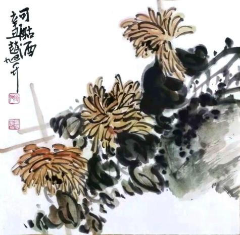 無論在寫生,還是創(chuàng)作過程中,趙旭升始終追求花鳥畫筆墨的干練、簡(jiǎn)約。經(jīng)過日積月累的自然觀察,以及對(duì)自然物象的不斷領(lǐng)悟,深深懂得花鳥草木的性情,并在作品中削其冗繁,得其神髓。我們?cè)谄洹队骸贰赌档?guó)色一品香》中能夠品讀到畫家深入生活、深入自然的創(chuàng)作理念,這些作品構(gòu)圖舒展穩(wěn)定,花瓣層層疊疊,具有“一朵妖紅翠欲流,春光回照雪霜羞”的感覺。畫家用細(xì)膩的藝術(shù)手法,將國(guó)色牡丹畫得格外豐潤(rùn),清香氤氳,一種恬淡的意韻躍然紙上,令人賞心悅目。其《晚香高節(jié)》中的菊花,具有“且看黃花晚節(jié)香”的寓意。挺拔的竹子,節(jié)節(jié)高,疏密有致的竹葉,順竹竿舒放。菊花、竹子依石而立,畫面雅致清爽,一股清剛之氣撲面而來,品之沁人心脾,同時(shí)也寫出畫家胸臆。趙旭升的《秋來色更佳》《可酤酒》《東籬秋色》,把菊花堅(jiān)強(qiáng)不屈、氣韻超逸、孤傲脫俗的精神品質(zhì),用藝術(shù)的手法再現(xiàn)給受眾,耐人尋味。