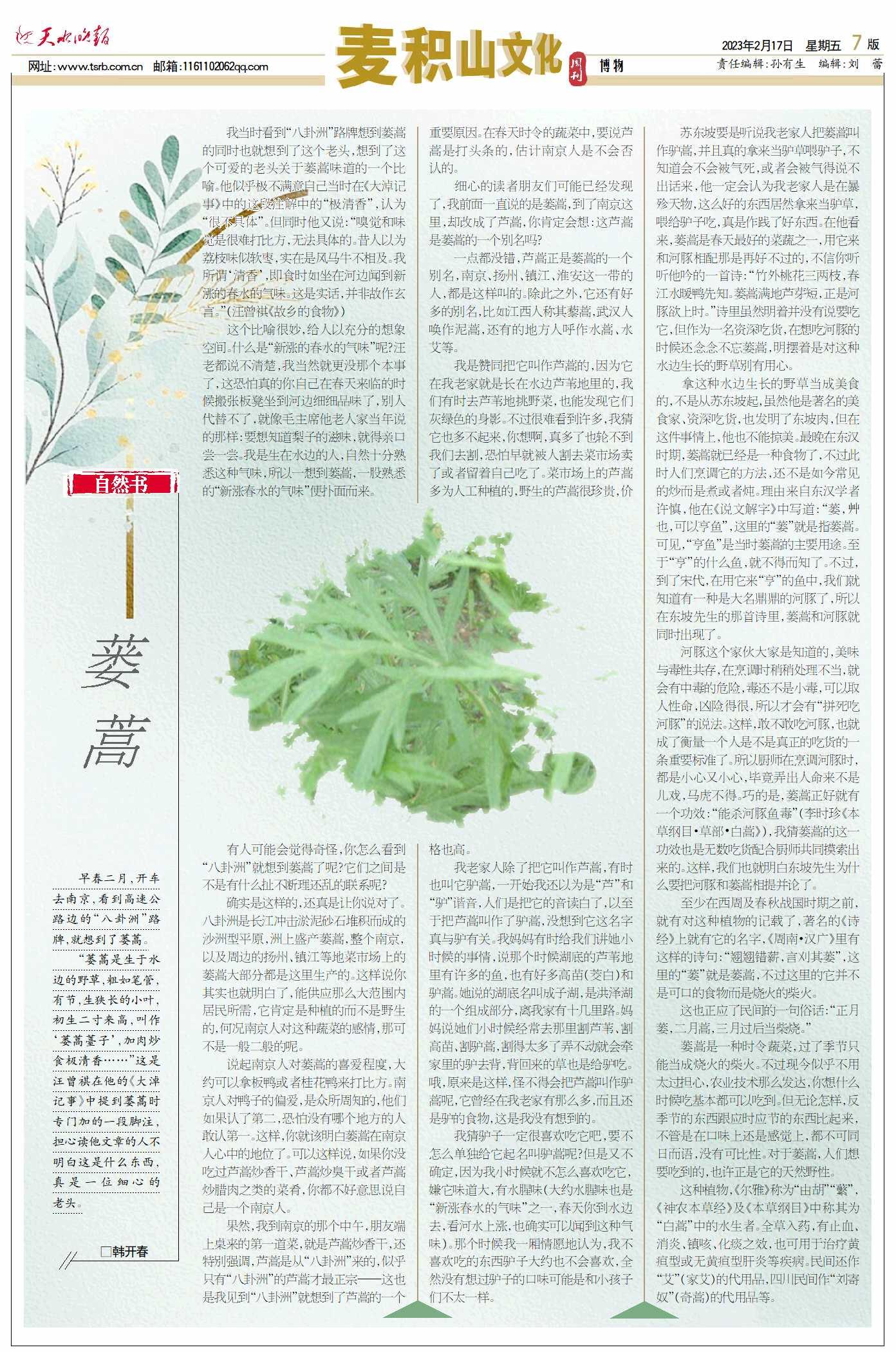 這個(gè)比喻很妙,給人以充分的想象空間。什么是“新漲的春水的氣味”呢?汪老都說不清楚,我當(dāng)然就更沒那個(gè)本事了,這恐怕真的你自己在春天來臨的時(shí)候搬張板凳坐到河邊細(xì)細(xì)品味了,別人代替不了,就像毛主席他老人家當(dāng)年說的那樣:要想知道梨子的滋味,就得親口嘗一嘗。我是生在水邊的人,自然十分熟悉這種氣味,所以一想到蔞蒿,一股熟悉的“新漲春水的氣味”便撲面而來。