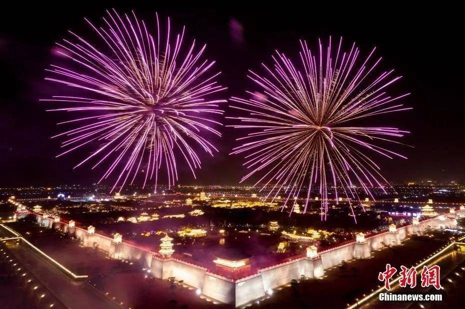 無人機(jī)航拍太原古縣城綻放的煙花。韋亮 攝