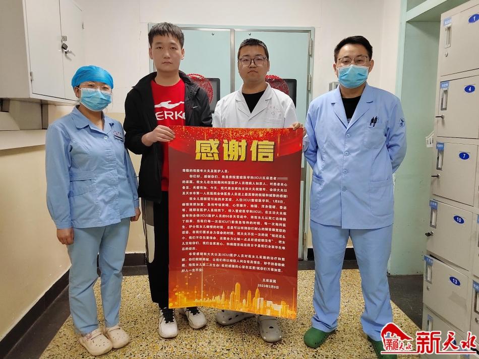 近日,ICU醫(yī)護人員再次收到了一位患者家屬送來的大紅紙感謝信。原來,這位女患者1月份因新冠引起并發(fā)癥,心率驟升、抽搐、渾身僵硬,昏迷不醒,到醫(yī)院診治時視病情被轉(zhuǎn)入重癥醫(yī)學(xué)科救治。進入ICU病房時,患者癲癇狀態(tài)持續(xù),急性呼吸衰竭,神志淺昏迷,呼吸急促顏面發(fā)紺。醫(yī)護人員先后采取各種措施進行搶救治療,并行氣管切開術(shù)。術(shù)后不斷優(yōu)化診療方案,護理團隊寸步不離與病魔抗?fàn)?。?jīng)過一段時間的救治,患者病情日趨穩(wěn)定,各項監(jiān)測指標(biāo)好轉(zhuǎn),3月6日起停用有創(chuàng)呼吸機,使用氣切套管內(nèi)吸氧,3月底順利出院。其家屬在信中滿懷感激地說,愛女進入ICU后,醫(yī)護人員視病人如親人,對患者關(guān)心備至,經(jīng)過50多天的苦戰(zhàn),將她從死亡線上救了回來,是ICU的醫(yī)生和護士給了愛女第二次生命,挽救了他們一個完整的家,他們非常感謝醫(yī)護們高超的醫(yī)術(shù)和精心的護理。
