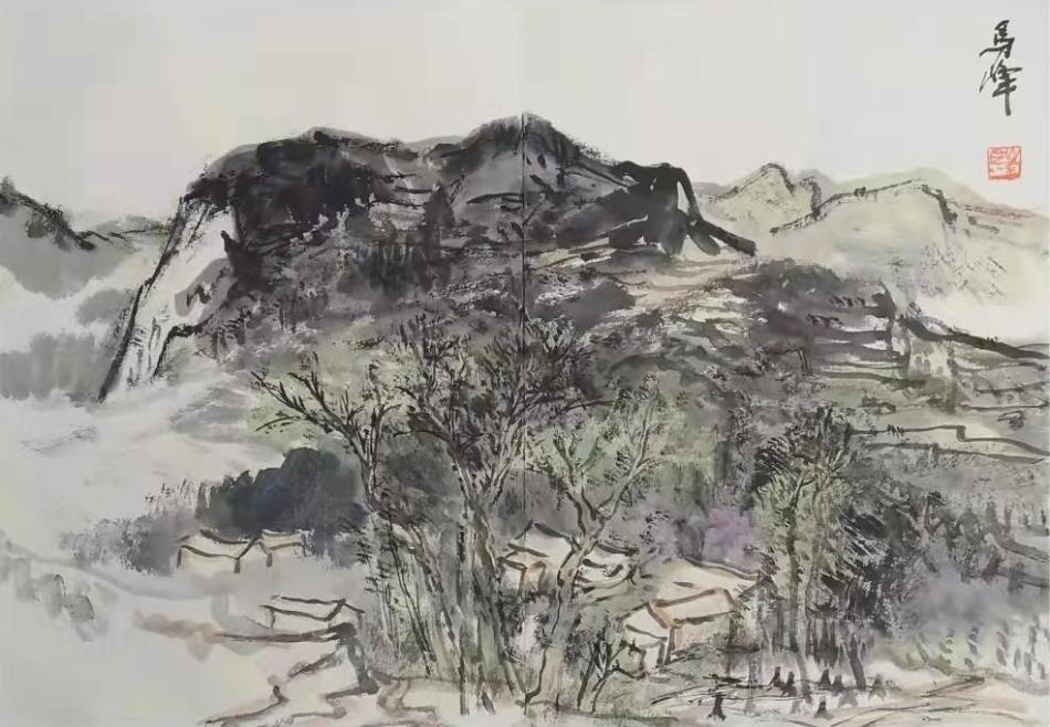 馬峰繪畫科班出身,畢業(yè)后一直在古仇池境地的洛峪教書,那里山巒縱橫、奇峰幽谷,是畫畫的絕佳境地。他畫的就是那一片天地,所以他的畫有一種“邊塞”隱逸的味道,疏林避舍、高崖云橫,這也是隴南大多數(shù)人的生命上流處新,富有田園農(nóng)耕的特色。隴南依山傍水、曲陌林野、溪澗流泉,世代耕讀傳家,一看到那些瓦屋密樹就觸動(dòng)人的神經(jīng)。他試圖隨機(jī)表達(dá)時(shí)代新景,也無不可,只是這樣落入既定的題旨范式,被物象所纏,往往失去旨趣張力。寫生即是寫心,古人“目識心記”同樣能畫出不凡妙境來。