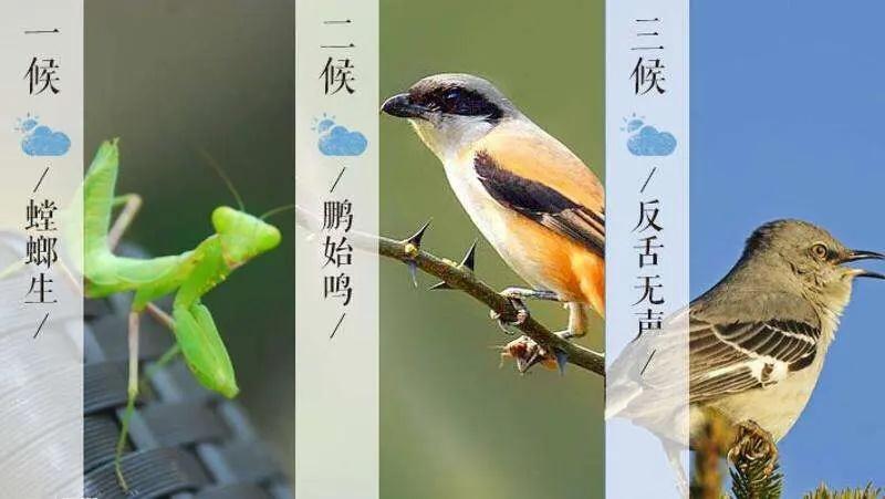 中國古代一些文學(xué)作品將芒種節(jié)氣十五天分為三候:一候螳螂生,二候鵙始鳴,三候反舌無聲。意思是在芒種節(jié)氣時,螳螂卵因氣溫變化而破殼生出小螳螂;喜陰的伯勞鳥開始在枝頭出現(xiàn),并且感陰而鳴。而反舌鳥,卻因感應(yīng)到了氣候的變化,慢慢停止了鳴叫。
