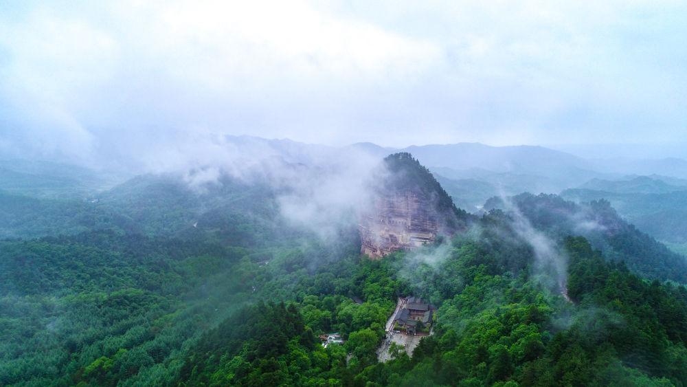 這是5月31日拍攝的煙雨籠罩下的麥積山石窟(無人機(jī)照片)。新華社記者 郎兵兵 攝