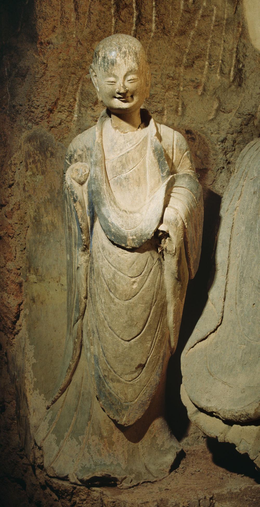 這是麥積山石窟第133窟小沙彌立像,因微笑迷人,被譽(yù)為“東方微笑”。(麥積山石窟藝術(shù)研究所供圖)
