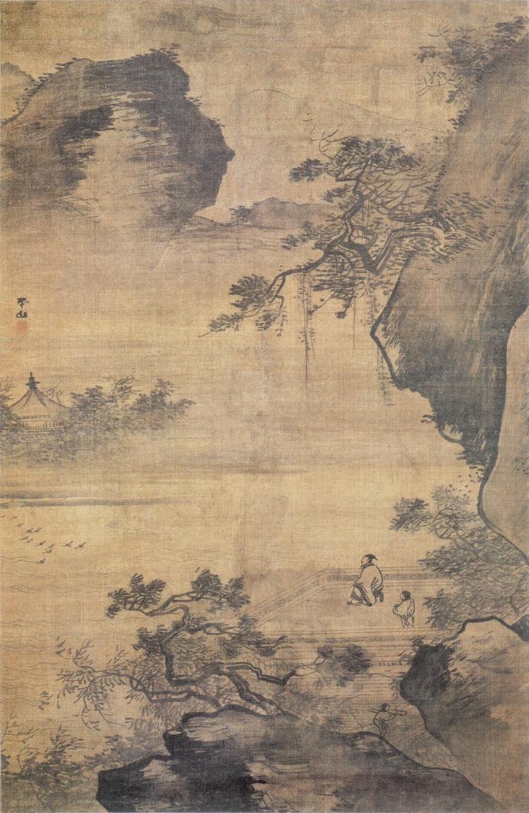 幾塊巨石形成的懸崖之上,有老樹藤蘿纏繞錯(cuò)布,迎風(fēng)而搖曳多姿。懸崖下有石砌高臺(tái)一個(gè),四周欄桿相圍。高臺(tái)中央有一長(zhǎng)者,端坐小凳之上,正在觀看江上逐浪而飛的一群大雁,身邊有一佇立的童子伺候。臺(tái)下的石階上,一童子抱琴正在拾級(jí)而上,他可不能誤了主人的雅興。江上云霧迷蒙,對(duì)岸有樹叢掩映的亭臺(tái)一座,其后是若隱若現(xiàn)的近巒遠(yuǎn)山……