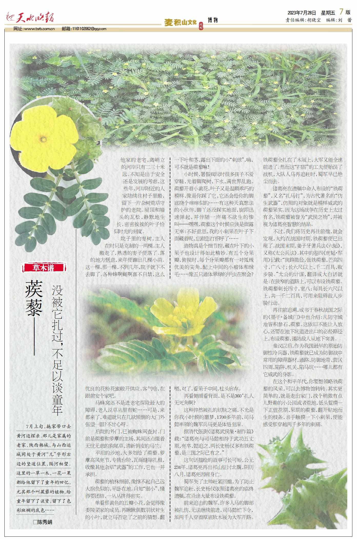 在這個和平年代,你要想領(lǐng)略鐵蒺藜的風(fēng)采,可以去博物館轉(zhuǎn)轉(zhuǎn)。其實(shí)更簡單的,就是走出家門,找個稍微有點(diǎn)兒野趣的小公園或者荒地,低頭踅摸一下正值花期、果期的蒺藜,翻開貼地而生的枝條,親手觸摸一下小刺果,便能感受那穿越兩千多年的刺痛。