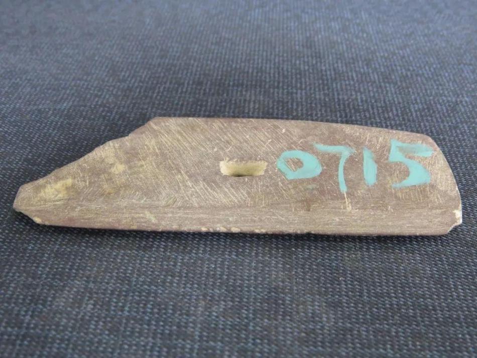 張家臺(tái)子遺址出土馬家窯文化帶孔石刀。長(zhǎng)11.1厘米,寬4.6厘米,厚0.6厘米,重75克。石質(zhì),長(zhǎng)方片狀,表面磨光,直刃直背,中間鉆一小孔,薄厚不均勻,邊緣薄于中部,一角殘缺。