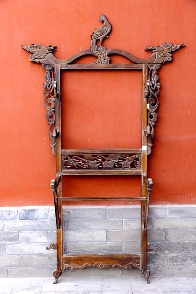 天水市博物館館藏壁掛式琴棋書畫紋衣帽架,清代,高152厘米,寬90厘米。核桃木制作,整體呈長方形。衣帽架的上部搭腦為龍頭,龍頭向外伸展,中間雕一亭亭玉立的鳳凰。龍頭下兩側(cè)邊上部鑲卷草龍頭掛牙,兩豎邊條上分別鑲鳳頭、象頭、龍頭掛鉤,層層伸出,最底層掛鉤下有斜棖。衣架底層橫棖雕蓮花紋。中部為中牌子,內(nèi)透雕琴棋書畫紋飾。