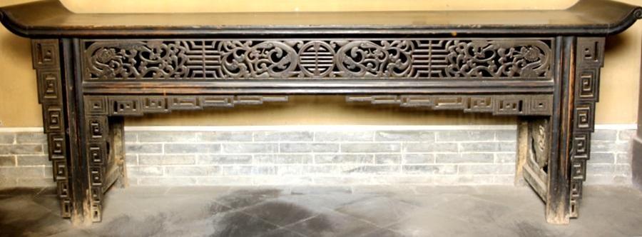 天水市博物館館藏透雕四龍團(tuán)壽紋卷頭案,清代,長261厘米,寬59厘米,高92厘米。案面攢寬邊框鑲獨(dú)板心,兩端做卷書翹頭,面下鑲透雕連續(xù)草龍捧壽紋牙條,正中透雕團(tuán)壽紋,團(tuán)壽紋左右兩側(cè)對稱透雕雙龍團(tuán)壽紋飾。直棖與兩腿間均鑲回紋角牙。前腿外側(cè)鑲回紋掛牙。兩側(cè)擋板透雕如意紋,如意云頭透雕古錢文。案面、直棖及四腿均做打洼處理。