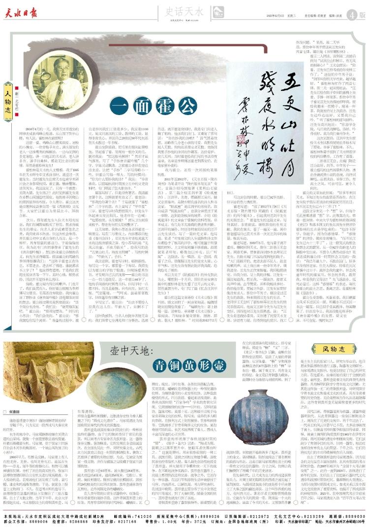 霍公把這篇文章寄給《天水日報》副刊部,隨文還附了一封親筆短函,編輯胡曉宜拍照給我看了:“編輯先生:寄上拙稿一篇,請審處。承寄贈《天水日報》,常閱讀,乃知家鄉(xiāng)繁榮景象,謝謝。即致,敬禮!霍松林。”時間是2012年2月11日。