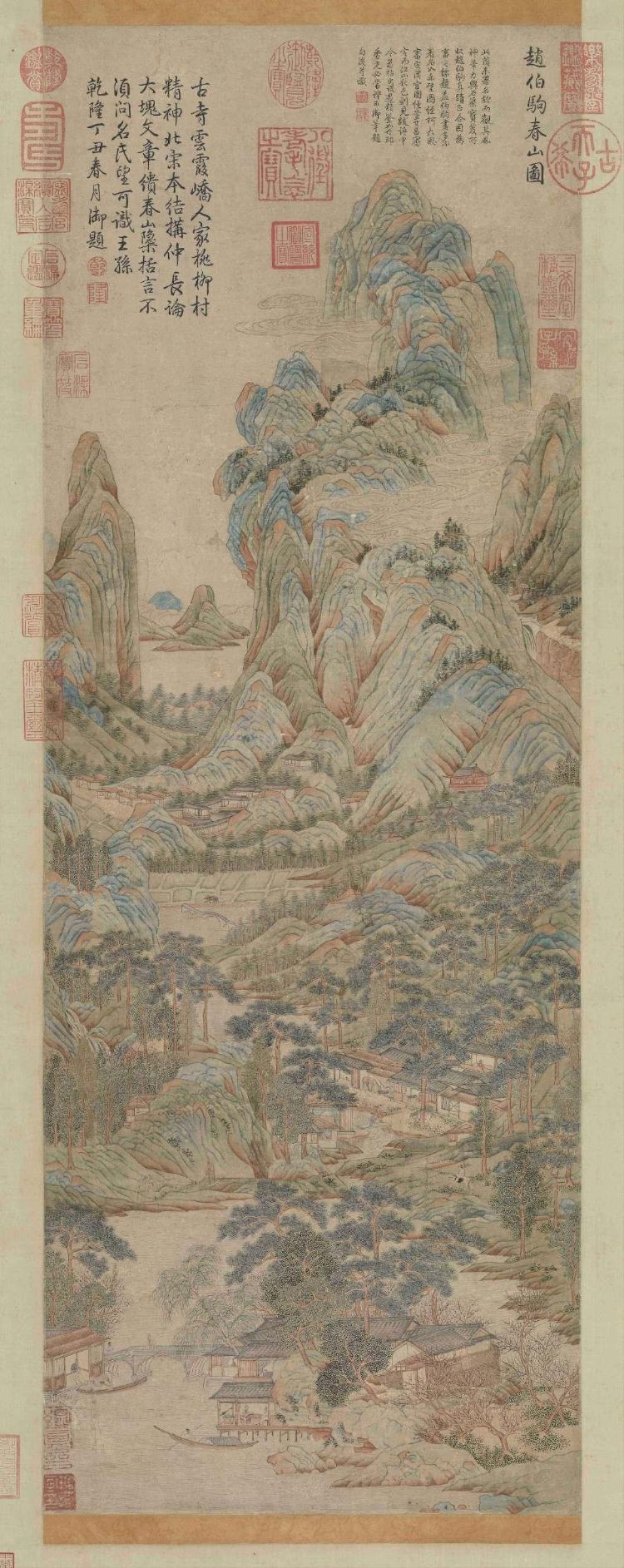 趙伯駒,字千里,宋室宗親,宋太祖的七世孫。官至浙東兵馬鈐轄。擅畫,人物、花卉、翎毛、山水皆精。山水取法唐李思訓父子而趨于精密,筆墨秀勁工致,著色清麗雅致,又能融合北宋以來水墨山水畫之精華,別開生面,很受宋高宗趙構(gòu)的重用?!洞荷綀D》保留了唐代青綠山水畫的風貌,全圖工整細麗、層次清晰、勾線凝練、造型準確,描繪了青山綠水、美不勝收的春山佳景,勾畫了山村田園風光和人們自給自足、悠然閑適、心情舒暢的幸福生活,表現(xiàn)了恬淡靜謐、閑適安逸、太平祥和的社會景象,表達了作者向往美好幸福家園的理想情感?!洞荷綀D》上沒有畫家的名款鈐印,卻有清乾隆皇帝的題跋和題詩,題詩云:“古寺云霞嶠,人家桃柳村。精神北宋本,結(jié)構(gòu)仲長論。大塊文章繢,春山檃括言。不須問名氏,望可識王孫。”