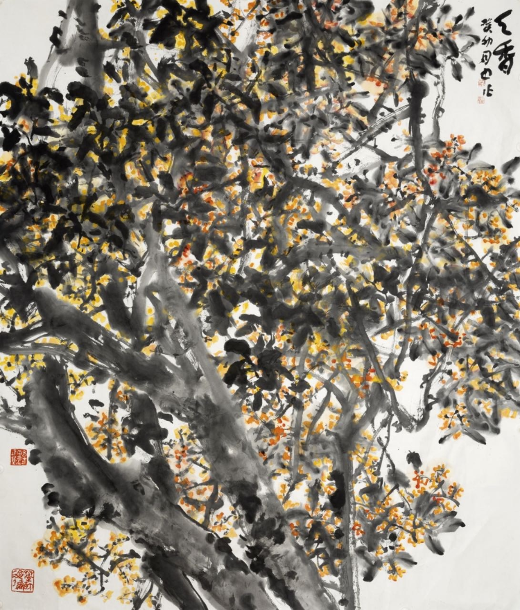 三是水色交融,渾然天成。1702年,石濤在一幅畫上題跋:“一變于水,二運(yùn)于墨,三受于蒙,水不變不醒,墨不運(yùn)不透,醒透不蒙則素,此三勝也?!彼?、墨、蒙說透了水色蒙養(yǎng)的重要性?!冻磷頄|風(fēng)》《紫藤掛云木》《田田翠葉紅蓮香》特別能體現(xiàn)他水色蒙養(yǎng)、用水用色的特點。赤橙黃綠青藍(lán)紫,他持彩練當(dāng)空舞。大膽用水,瀟灑用色,點、烘、敷、抹,蒙養(yǎng)到位,渾然一體。其水氤氳飽滿、浸染朦朧、剔透玲瓏;其色鮮艷明麗、燦爛清新、豐富喜慶。水即是色,色即是水。古人說墨分五色,實際上他的畫不止五色。因為水用得好,色就千變?nèi)f化,創(chuàng)作的作品水色迷人,遠(yuǎn)看近觀水色一天。紅花墨葉成就了大師齊白石。燃燒的《向日葵》、金黃的《麥田》成為西方印象派大師梵·高的代表作。大膽借鑒齊白石、梵·高的用色,在色彩選擇中注入主觀感受,來營造出貼合自己心境的畫面,成為章月中花鳥畫的一大特點:水色淋漓、墨彩交輝。水色帶給觀賞者的愉悅,如春日里看到的鮮花、夏日里吹到的清風(fēng)、秋日里摘到的碩果、冬日里曬到的暖陽,愜意、暢快,心生歡喜。
