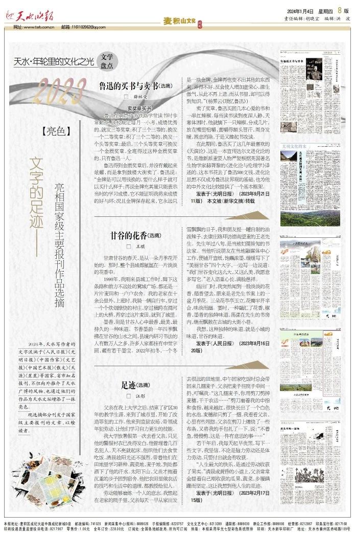 2023年,天水寫作者的文字流淌于《人民日?qǐng)?bào)》《光明日?qǐng)?bào)》《中國作家》《文藝報(bào)》《中國藝術(shù)報(bào)》《散文》《天涯》《星星》等國家、省市知名報(bào)刊,不但向外推介了天水廣博的風(fēng)物,也通過他們的作品為天水文壇增添了一抹亮色。