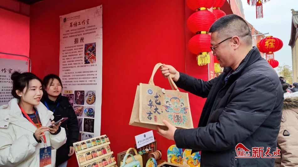由甘肅工業(yè)職業(yè)技術(shù)學(xué)院革悟工作室?guī)淼囊患O具天水地域文化和龍文化元素的非遺文創(chuàng)產(chǎn)品,亦是吸引了眾人駐足購買。一位帶著嘉賓證的消費(fèi)者對該工作室設(shè)計(jì)的一款麻制托特包愛不釋手,在問過價格后便爽快付款。經(jīng)過詢問,記者才知道這位顧客是慶陽市文體廣電和旅游局四級調(diào)研員左紅,他告訴記者,革悟工作室設(shè)計(jì)的包很好地將非遺融合進(jìn)了當(dāng)代生活,價格也很親民,且產(chǎn)品在配色上非常雅致,與龍、與年結(jié)合得非常緊密,不管是自己背還是送人,都很喜慶。