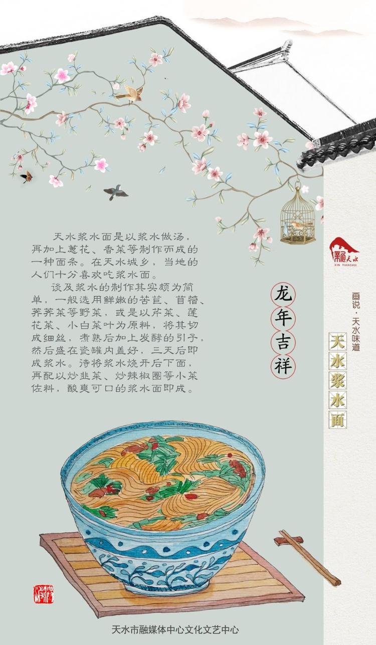 天水漿水面是以漿水做湯,再加上蔥花、香菜等制作而成的一種面條。在天水城鄉(xiāng),當?shù)氐娜藗兪窒矚g吃漿水面。