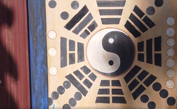 在殿正中的墻壁上畫(huà)有一幅巨大的八卦圖,上面除了八卦以外,還畫(huà)有日月星辰天體圖、二十八宿星座、二十四節(jié)氣及六十四卦方位等,繪畫(huà)獨(dú)特,造型美觀,尤其在圖內(nèi)標(biāo)有代表“天、地、水、火、山、雷、風(fēng)、澤”八種自然現(xiàn)象的八卦符號(hào),圖案里面所包含的玄機(jī),令人百思不得其解。