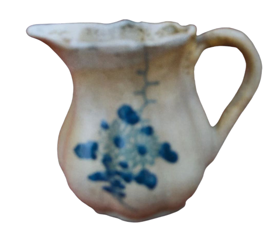 該口杯高10cm,上口手捏黏泥接連,珍珠釉澆注粘連處留有數(shù)滴珍珠釉淚珠??谘厍皟A,連口粘痕明顯裸露。通體呈吊南瓜分棱,八道指泥壕顯八股棱條。造型珍瓏靈秀,珍貴之處在于上施淺瑪瑙釉,體面使用藍寶石礦料畫一束盛開的菊花。畫筆嫻熟簡練,富有立體感,且活靈活現(xiàn)。在背面腰中部,用淡青花題“□□”二字,字雖模糊不清,但胎土細膩,瓷壁輕薄又堅硬如骨,胎底色黃中泛紅,瓷體表面青釉中又泛小針褐色點。把手處,窯變?yōu)轵球咀吣嗉y。這種泥紋,沉重古樸,明亮而深沉,是釉層在干燥或燒成時發(fā)生干裂,后在高溫階段又有釉流入填補而形成的。在民國以前,蚯蚓紋曾被作為判斷鈞釉的唯一標(biāo)準(zhǔn)。