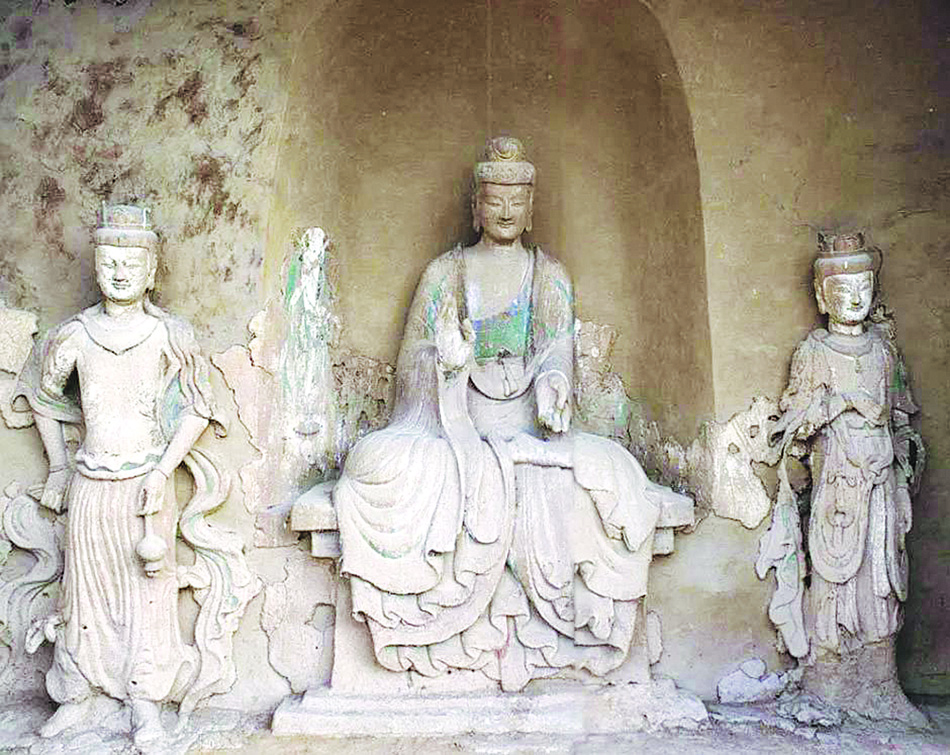 從西魏時期的長安到達(dá)麥積山需要十天之久,石窟開鑿在懸崖峭壁之上,洞窟“密如蜂房”,棧道“凌空飛架”,層層相疊形成一個宏偉壯觀的立體建筑群。在麥積山東崖下部的44窟,原為平面方形,復(fù)斗式四面坡頂,正壁開一圓拱形淺龕,現(xiàn)存造像四身,正壁龕內(nèi)主尊佛,龕外兩側(cè)各一脅侍菩薩,左壁存一弟子。該窟造像造型優(yōu)美,軀體飽滿豐潤,細(xì)膩光潔,是麥積山石窟西魏時期最有代表性的造像。