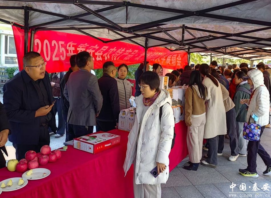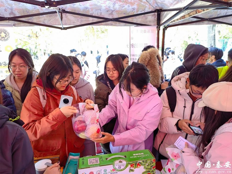 展銷現(xiàn)場人頭攢動,氣氛熱烈。來自秦安的各類特色農(nóng)產(chǎn)品琳瑯滿目,整齊陳列,吸引了大量師生駐足品嘗和選購。